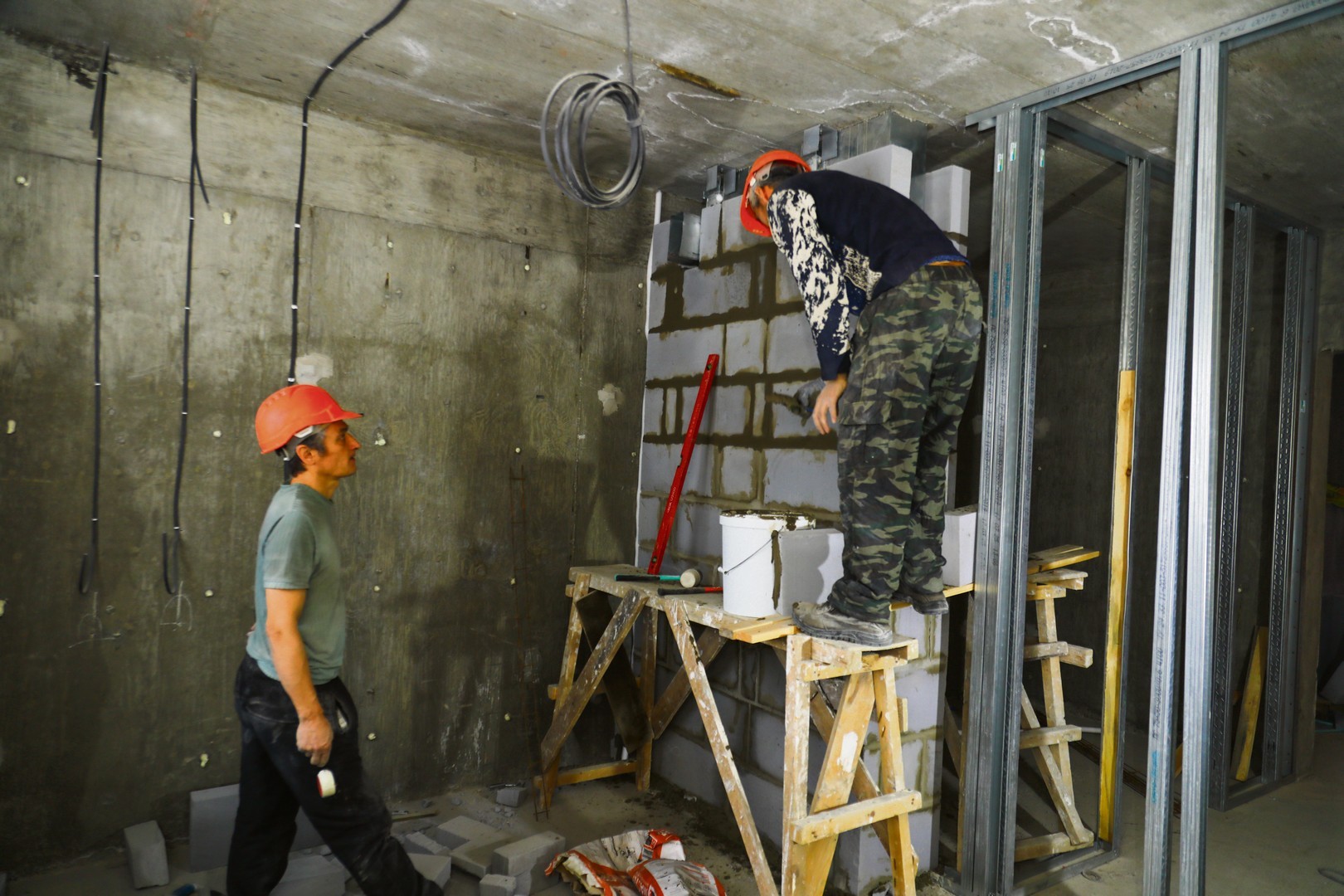 Еще немного — и сразу в пяти блок-секциях этого жилого комплекса квадратные метры, перегородки и стены превратятся в полноценные квартиры. Уже сейчас здесь видны очертания будущих помещений: стены построены, вентиляционные шахты обкладываются газоблоками, комнаты намечены металлическими профилями. Почти везде протянута электропроводка, а в комнатах установлены и греют радиаторы.