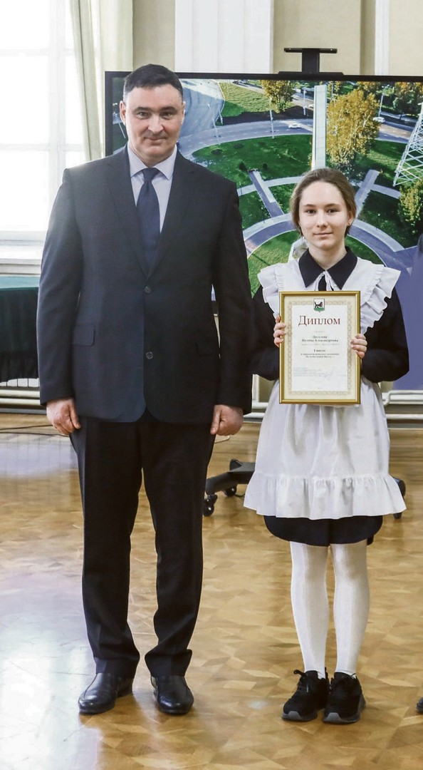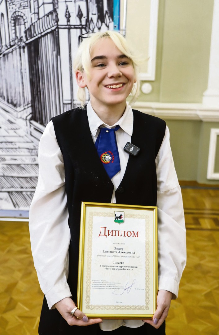 Полина Дягилева из школы № 23 получила от главы Иркутска Руслана Болотова диплом за первое место в конкурсе сочинений. И, знаете, о чем написала Полина? Представляя себя мэром, девушка поставила перед собой амбициозную задачу — сделать Иркутск городом-миллионником! Правда, на вопрос, хочет ли она на самом деле стать градоначальником, Полина, смутившись, ответила: «Нет, это слишком сложно, и меня не тянет в эту сферу, я уже выбрала биологию для профессии»