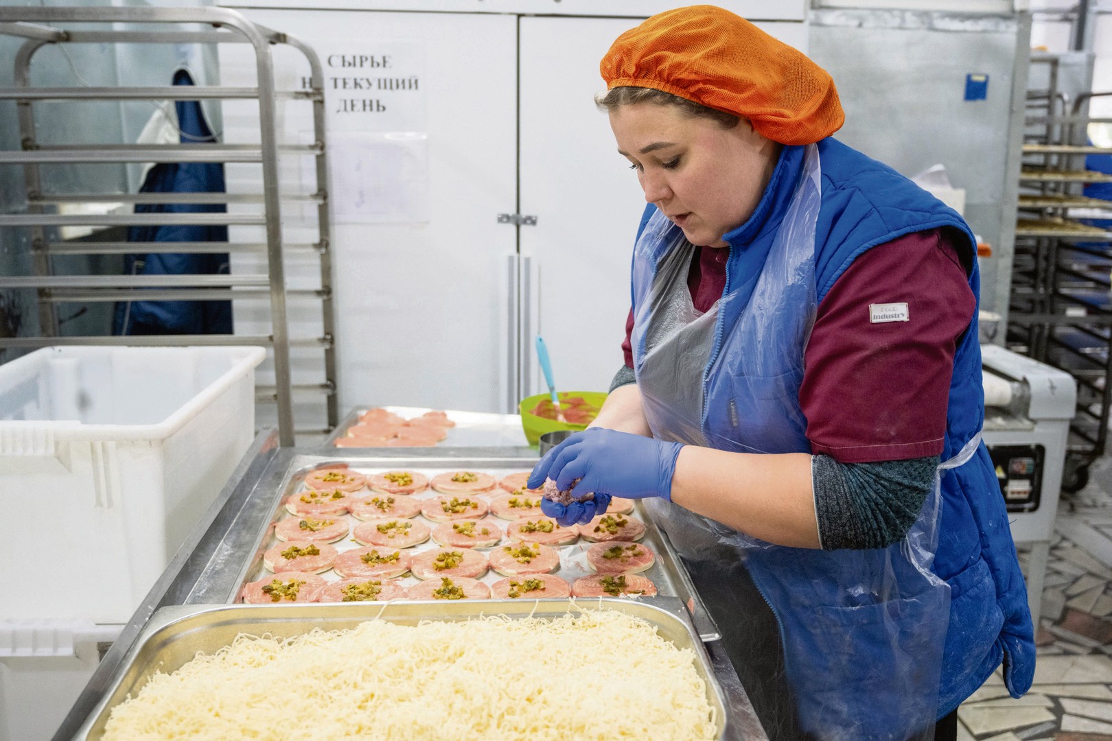 Ингредиенты будущей пиццы на основание из теста раскладывает изготовитель пищевых полуфабрикатов Лариса Горбань. Для сотрудников цеха замороженных полуфабрикатов АО «Комбинат питания» это относительно новый формат работы, однако у профессионала руки уже действуют автоматически — здесь производят 600 единиц пиццы в день!