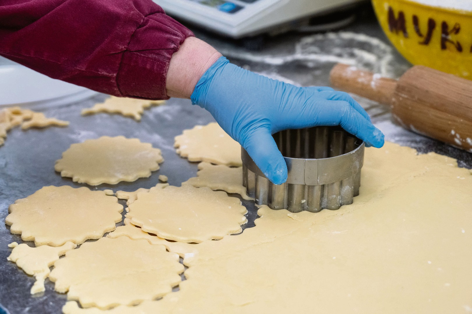 — Для творожников мы используем песочное тесто: берем сливочное масло, сахар, соль, куриные яйца, сметану и, конечно, муку, — перечисляет основные составляющие Марина Голунова. — Замешиваем, потом раскатываем и вырезаем заготовки.