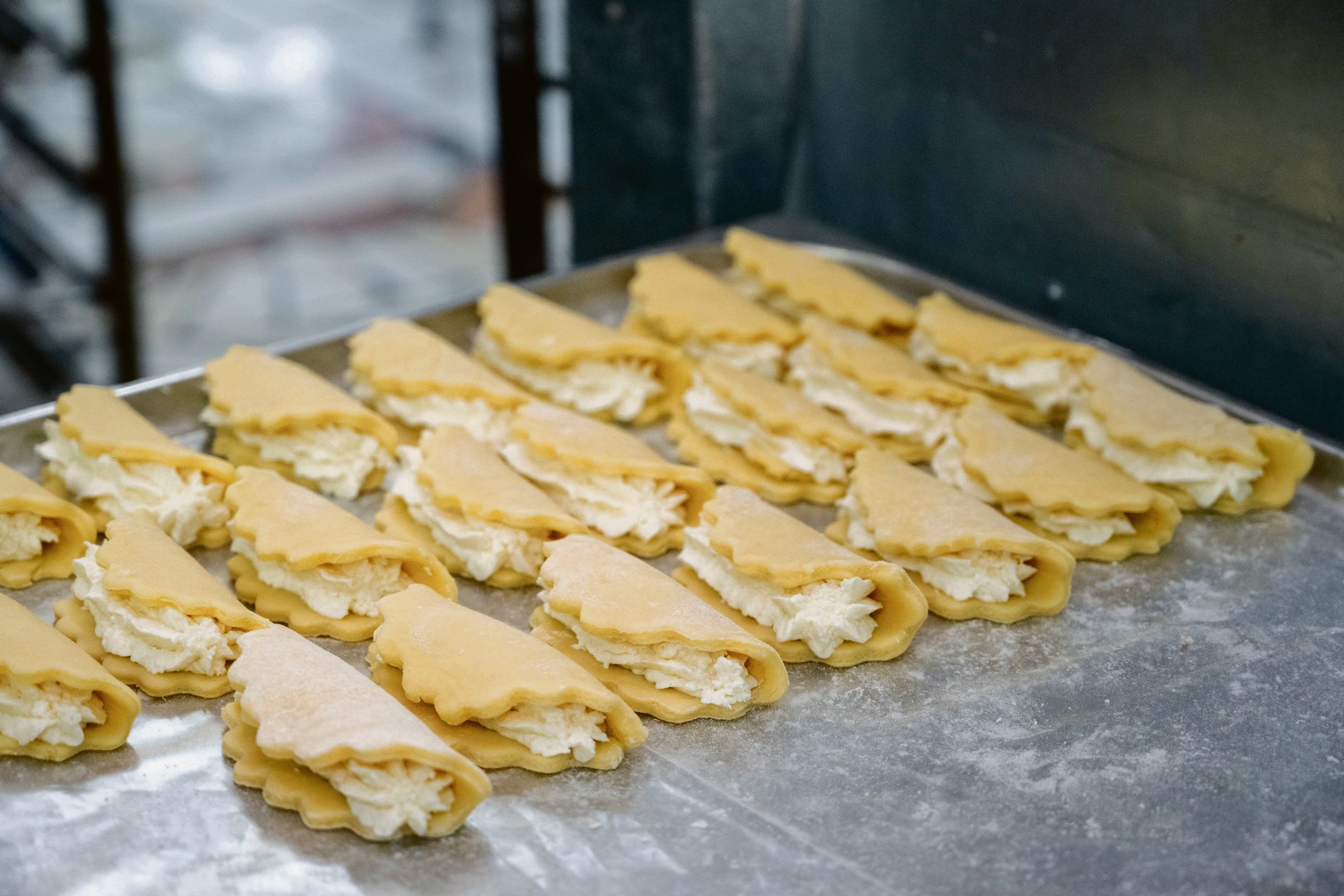 — Берем кондитерский мешок с фигурной насадкой, перекладываем туда творожную начинку и поочередно отсаживаем массу на заготовки из теста, — показывают сотрудники.