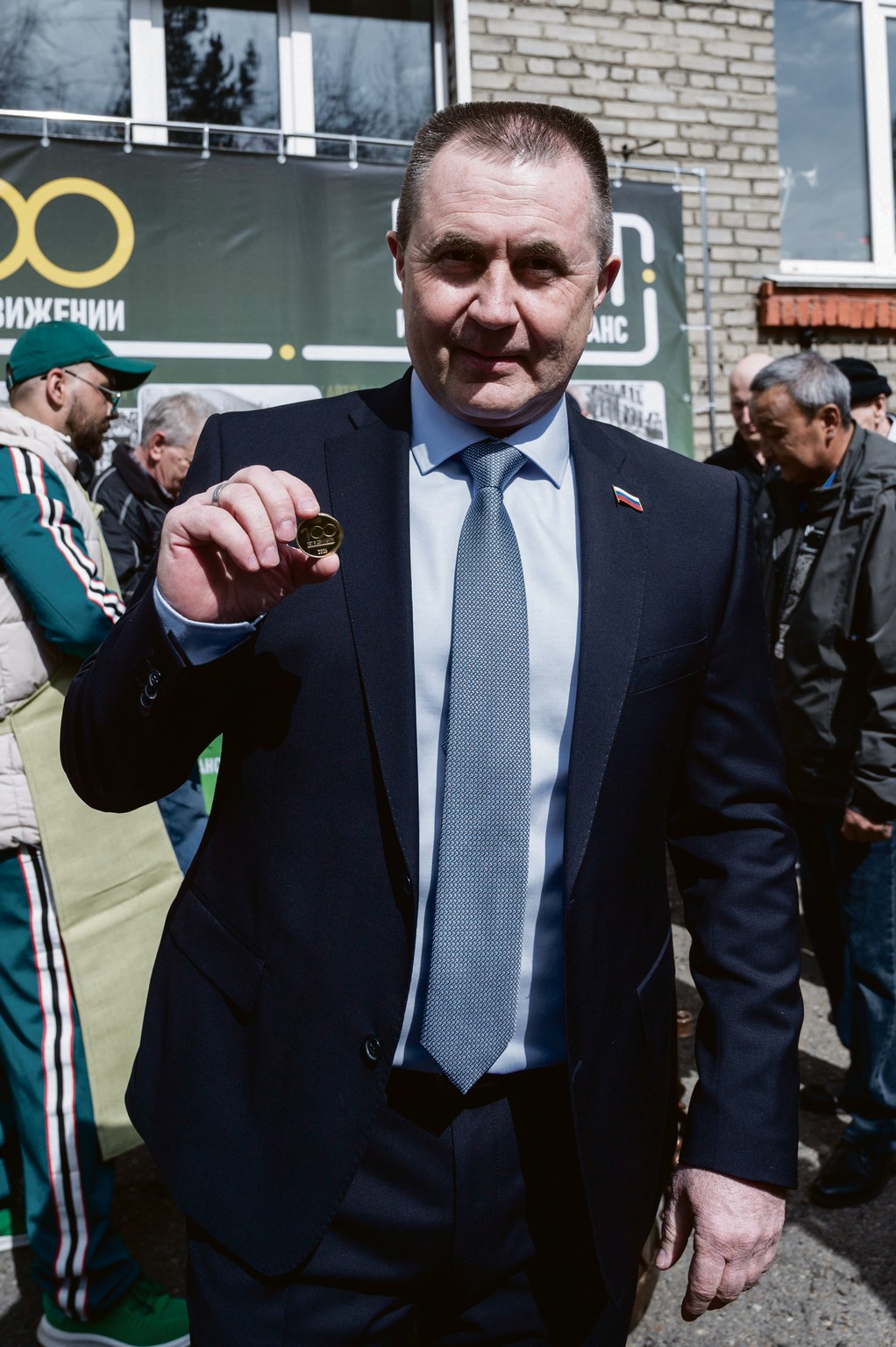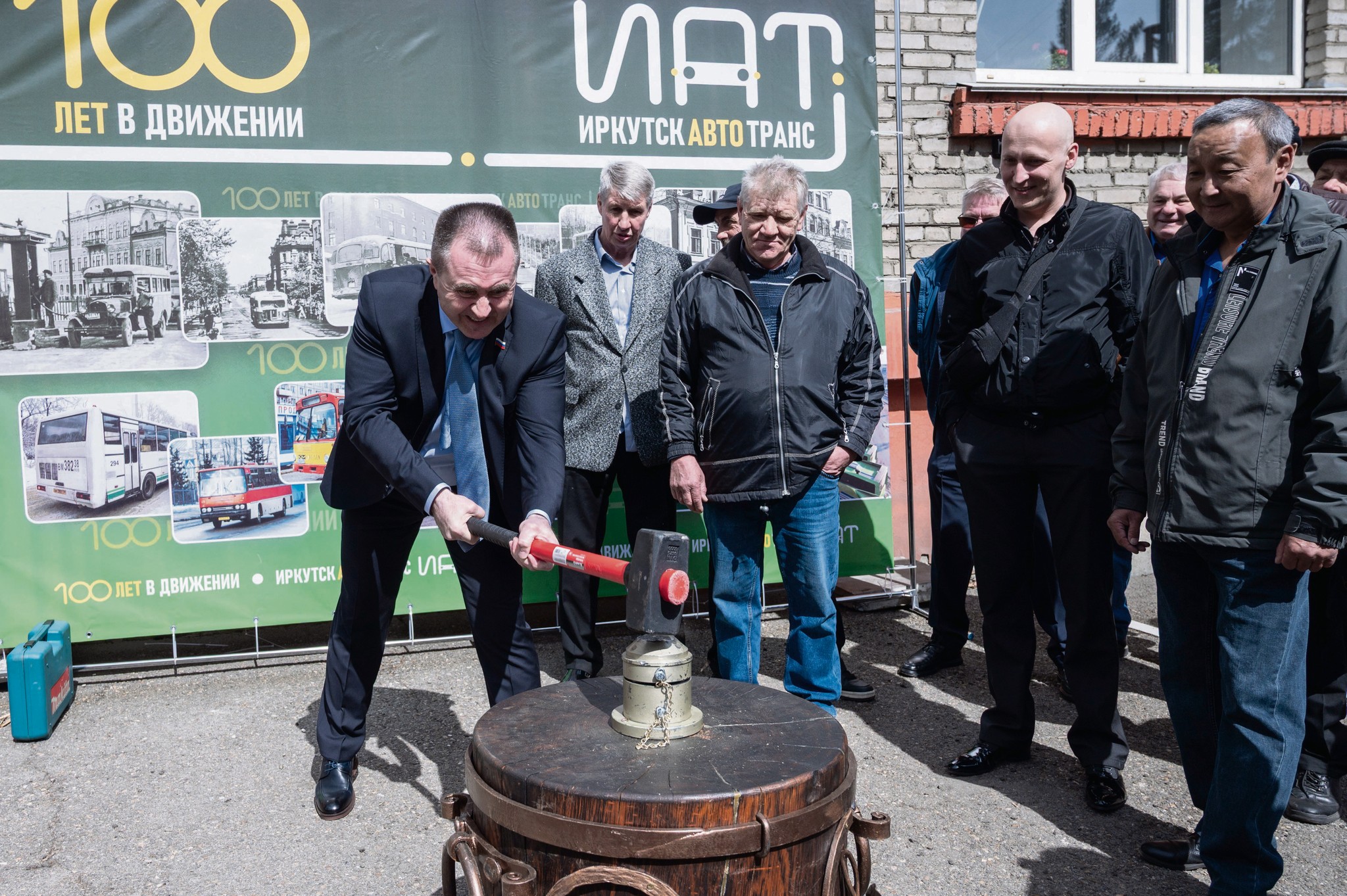 Человек с кувалдой — директор «Иркутскавтотранса» Алексей Колмаков, а события на снимке происходят незадолго до начала торжественного мероприятия! На специальной наковальне все пришедшие на юбилей могли отчеканить себе юбилейную монетку с символикой предприятия на память. Качество ковки зависело от точности и силы удара по заготовке. Возможностью сделать себе сувенир воспользовались практически все присутствовавшие, включая автора идеи Алексея Колмакова