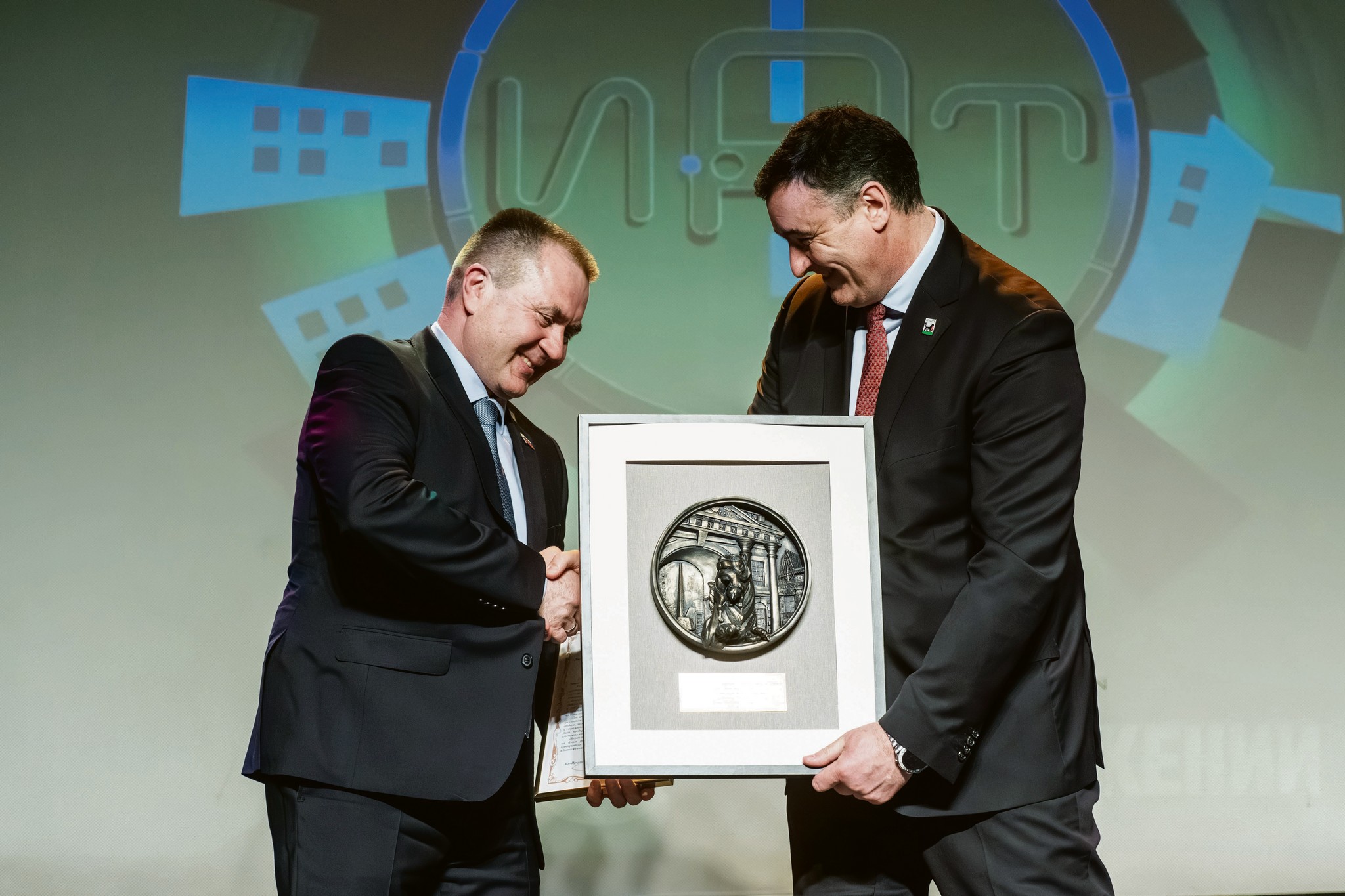 «100 лет в движении» — таков слоган празднования юбилея «Иркутскавтотранса». Но мы в редакции «Иркутска» с нашим стремлением к постоянному редактированию добавили бы в этот лозунг еще одно слово — «100 лет в позитивном движении». Таким мощным было позитивное послевкусие от праздника, такой непринужденной атмосфера в зале, такими счастливыми выглядели «юбиляры» — сотрудники предприятия… Даже обычно более чем серьезные мэр Иркутска Руслан Болотов и руководитель «Иркутскавтотранса» Алексей Колмаков не скрывали радости (на фото — Руслан Николаевич вручает Алексею Анатольевичу сувенирное панно с изображением достопримечательностей города)