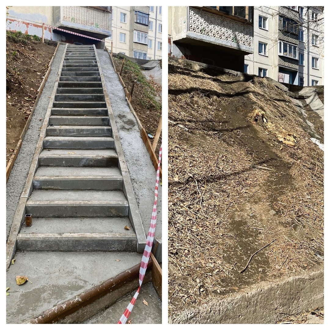 Вот из таких, казалось бы, мелочей и состоит комфорт горожан. На косогоре у дома № 31 на бульваре Рябикова в октябре прошлого года появилась долгожданная лестница. Сравните снимки до и после: еще недавно этот спуск был настоящим испытанием — скользко, опасно и страшно, особенно в гололед или дождь. А ведь это самый короткий и удобный путь для многих жителей Синюшиной Горы — к поликлинике, детским садам и школам. Теперь проблема решена