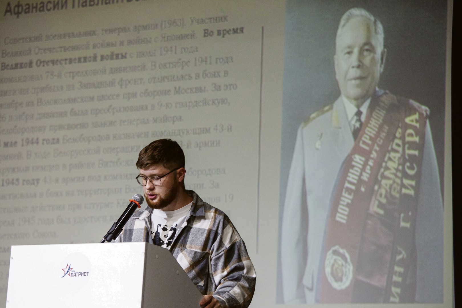 Один из докладов посвящен нашему земляку — советскому военачальнику, генералу армии, дважды Герою Советского Союза Афанасию Белобородову, принимавшему Парад Победы в Харбине. Его память чтят не только в Приангарье и России — гимназия № 9 в Витебске (город на северо-востоке Беларуси) с 2020 года носит имя знаменитого военачальника-сибиряка, освободившего город от сил вермахта в рамках операции «Багратион»