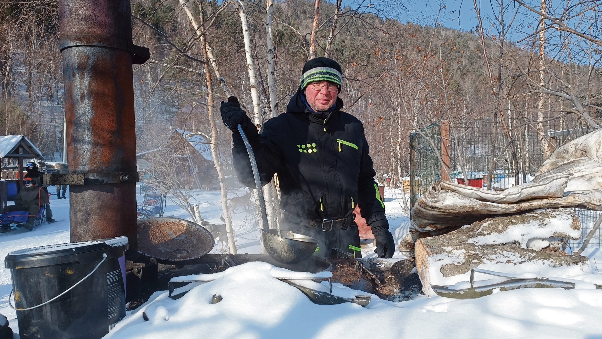 Каюр Сергей Моок — всю жизнь с собаками, хотя по профессии он переводчик. У себя дома, в Омске, разводил милых и пушистых сибирских хаски. Но уже шесть лет живет и работает у Тюрюминых. На этой печи Сергей вместе с коллегами каждый день готовит около ста литров питательной похлебки для собак