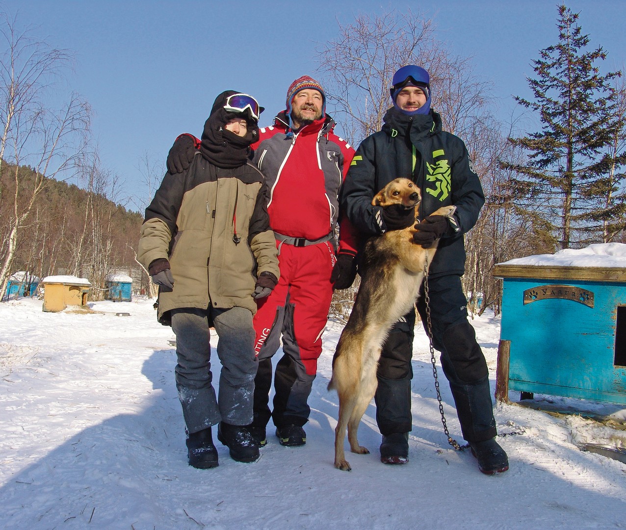 Тюрюмины (на фото слева направо): дочь Дарья, глава семьи Олег Анатольевич, сын Арсений. Это лишь малая часть родственников: в день приезда репортера «Иркутска» именно они занимались с собаками и возили туристов на упряжках. С ними — пес по кличке Удага, настоящий ездовой