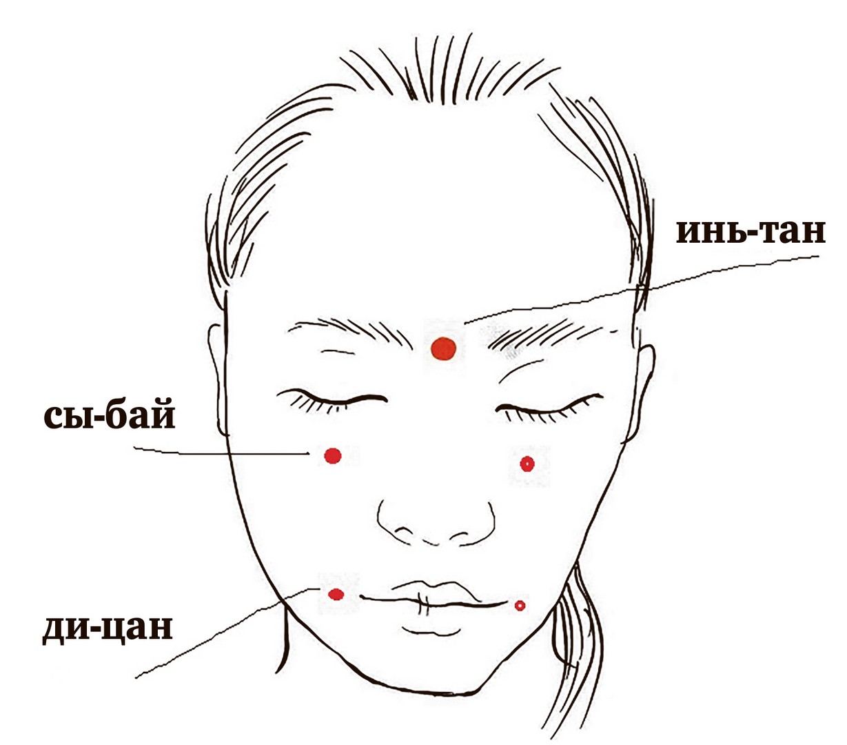 - Толкание точек ди-цан, расположенных примерно в сантиметре от уголков губ. При выполнении упражнения слегка приоткройте рот, нажимайте и толкайте точки кончиками указательных пальцев по 16 раз.