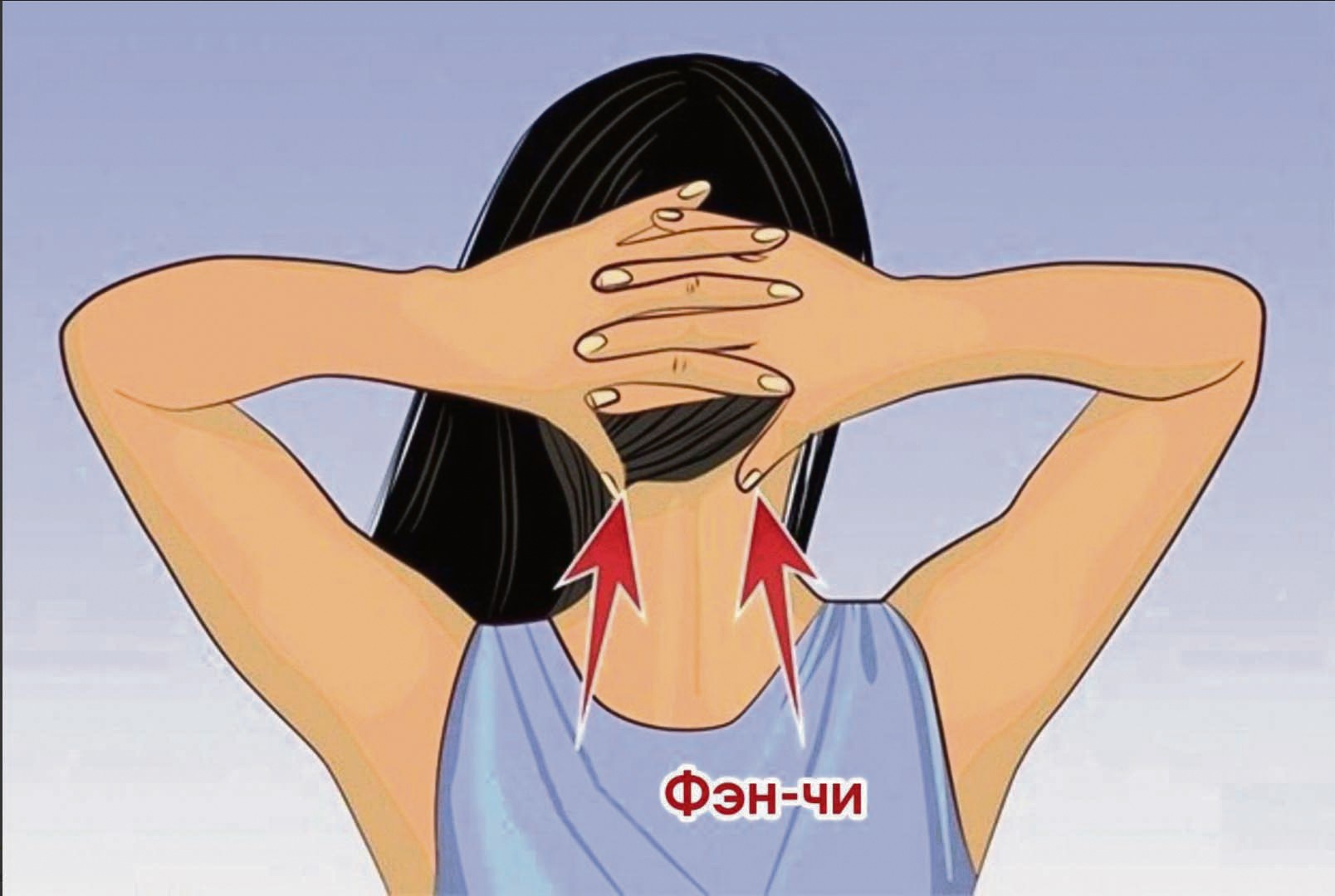 - Упражнение «Стук в небесный барабан». Прикройте уши ладонями. С помощью подушечек больших пальцев делайте мягкие круговые движения, воздействуя на точки фэн-чи (они расположены в ямочках под затылочной костью) — 16 раз. В завершение плотно зажмите уши ладонями, а затем с силой оторвите — повторить несколько раз.