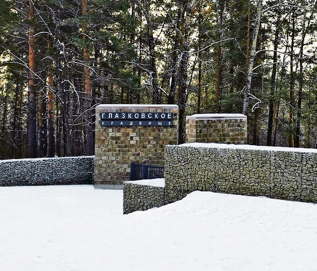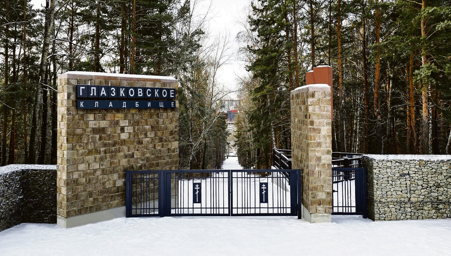 Так сейчас выглядит входная группа Глазковского кладбища: ворота, калитка, стела из двух стен, облицованных бетонным камнем, и ограждение из габионов длиной 400 метров. Гармонично, основательно и очень интеллигентно. В архитектуре есть понятие «кладбищенская эстетика»: кажется, проект архитектора Сергея Демкова, по которому благоустраивали старый погост левого берега, ему полностью соответствует. В создании проекта благоустройства Глазковского кладбища принимали участие архитектор Сергей Демков, инженер-генпланист Гульнара Губина, инженер-конструктор Елена Демкова. Заказчик — комитет городского обустройства администрации Иркутска