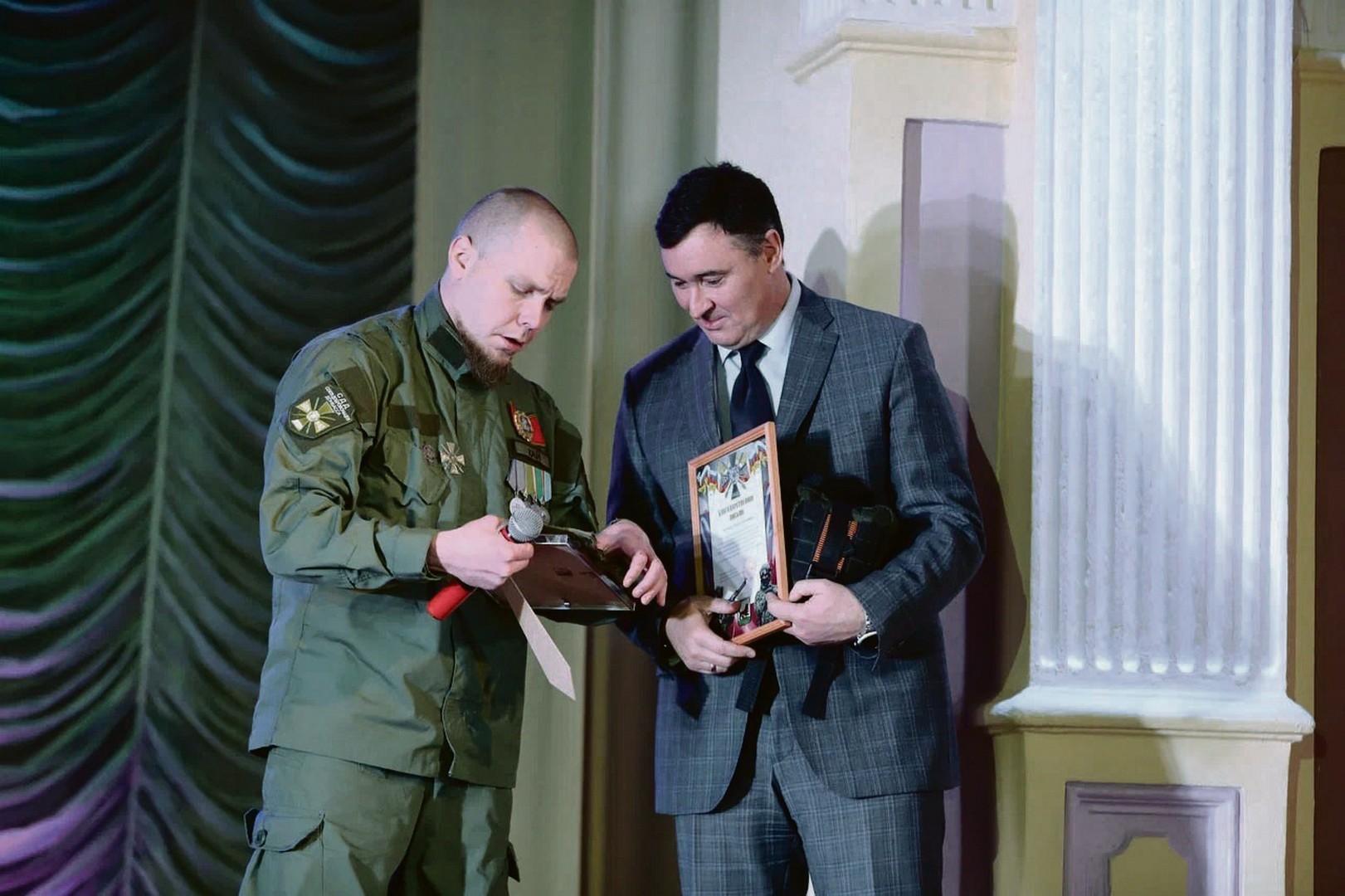 Удивительный и теплый момент во время церемонии «Социальная звезда»: сначала мэр нашего города Руслан Болотов вручил благодарственное письмо руководителю Иркутского регионального отделения «Союз добровольцев Донбасса» Федору Садовникову, а затем получил ответную награду — письмо и памятный подарок с фронта от земляков — участников боев Курского направления