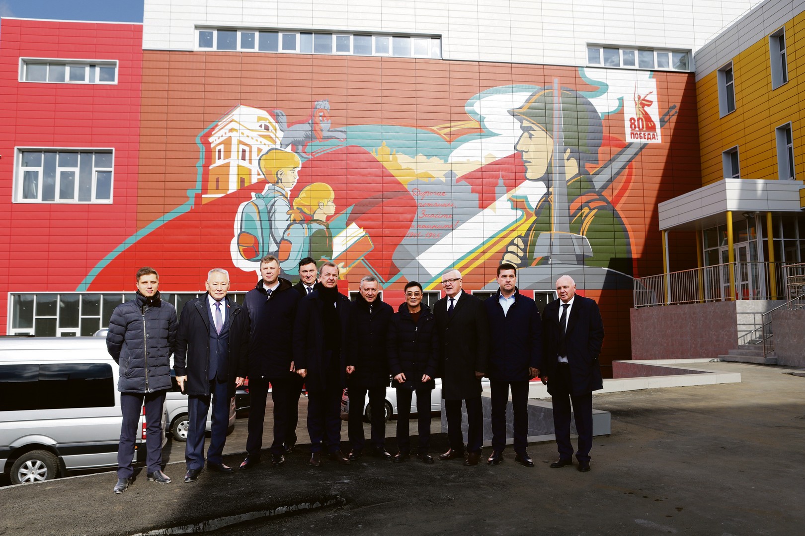 Фасад новой школы, которую город успешно построил за два с небольшим года, оформлен с акцентом на 80-летие Победы. На фото — октябрь прошлого года, в Иркутске тогда побывала делегация Совета Федерации во главе с первым заместителем председателя Совета Федерации Федерального собрания РФ Андреем Яцкиным. И, конечно, наш мэр Руслан Болотов устроил гостям из столицы экскурсию по школе на улице Ярославского, самой большой не только в городе, но и в области — на 1550 мест