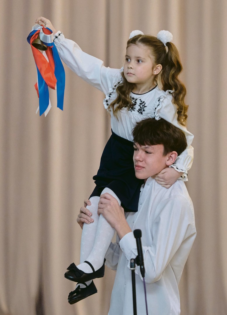 Кульминацией праздника стал первый звонок: почетное право подать его предоставили будущей первокласснице Арине Ничковой и Ивану Токмачеву из 9 «В». Зал взорвался овациями, когда на сцене появились старшеклассник и совсем еще маленькая девочка — Иван подхватил Арину на плечо, и, сделав почетный круг с колокольчиком, ребята скрылись за кулисами.
