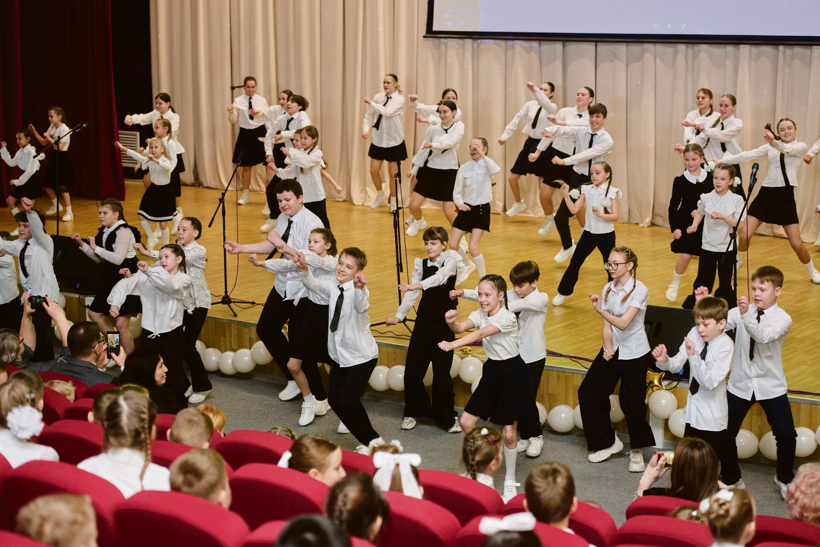 Со сцены звучит музыка, к зрителям один за другим выходят артисты с песнями и стихами, выступают танцевальные коллективы — школьники внимательны к каждому и не скупятся на аплодисменты.