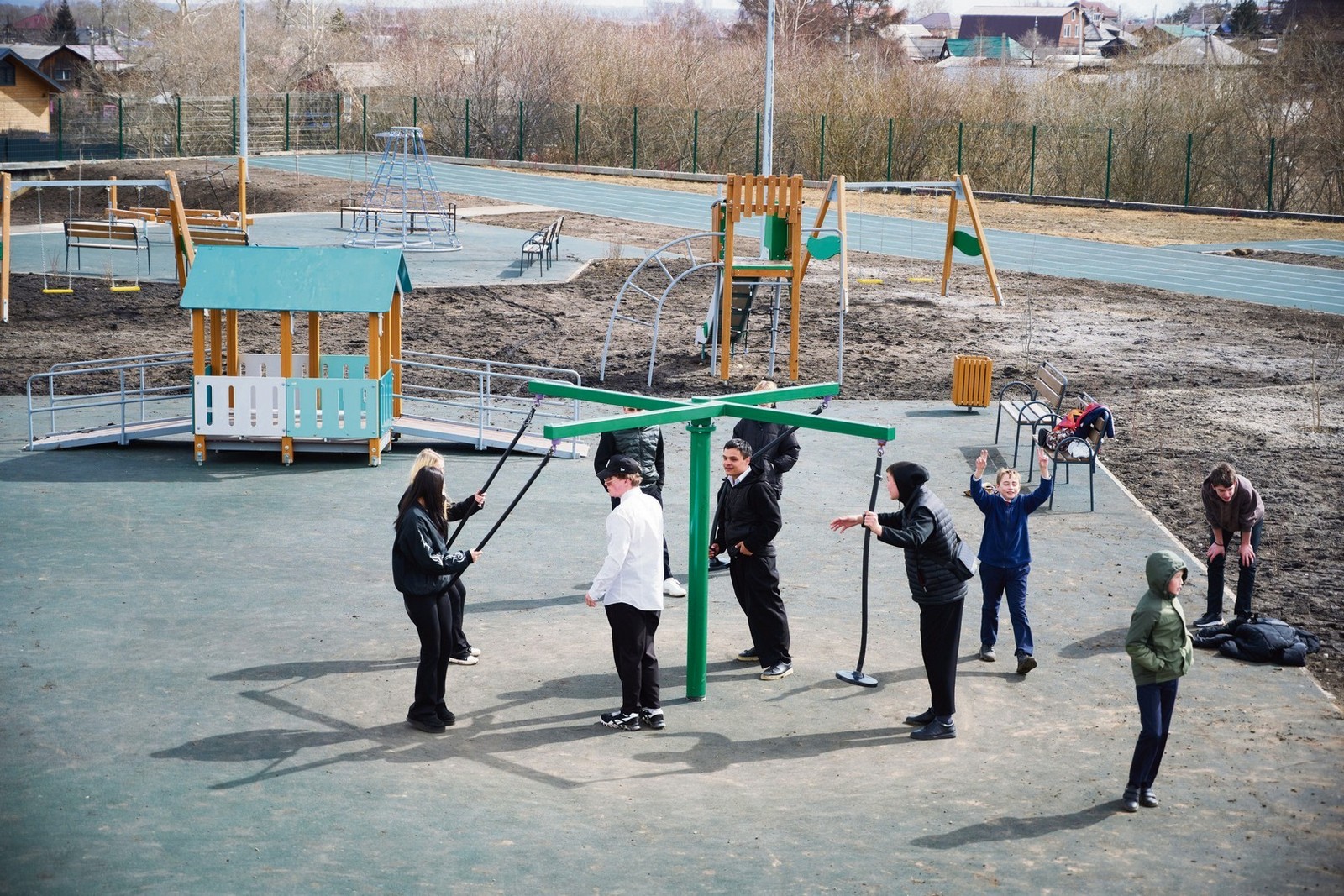 В школьном дворе уже вовсю бурлит жизнь — ребята осваивают необычную карусель на игровой площадке. На заднем плане — беговые дорожки