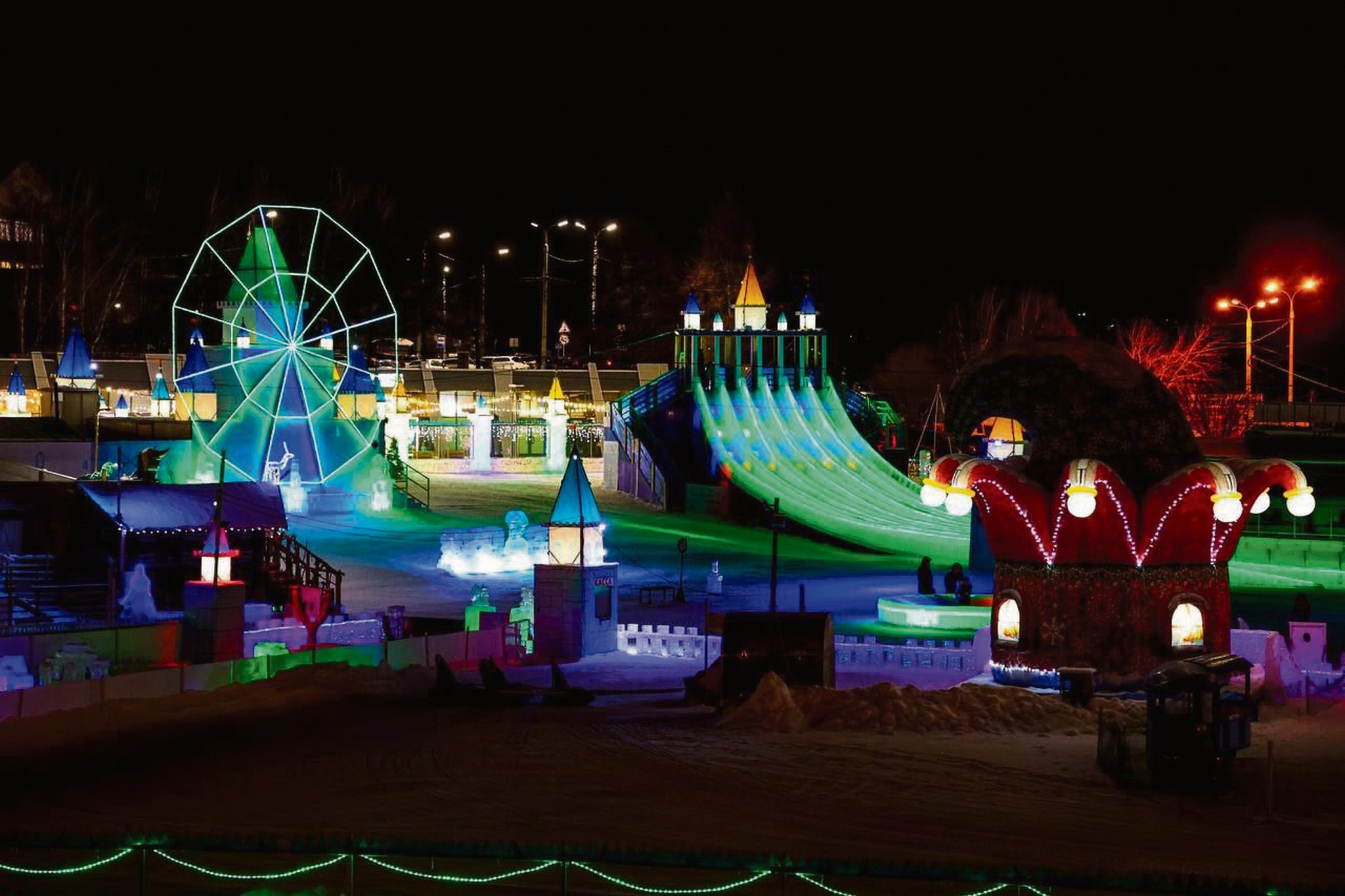 Вечером в ледовом городке очень красиво! Для этого великолепия на конструкциях закрепляют специальную влагоустойчивую светодиодную ленту. В ледовом городке «Хрустальная сказка» подготовили более 800 метров спусков, виражные горки, ледяные чаши и развлекательную программу.