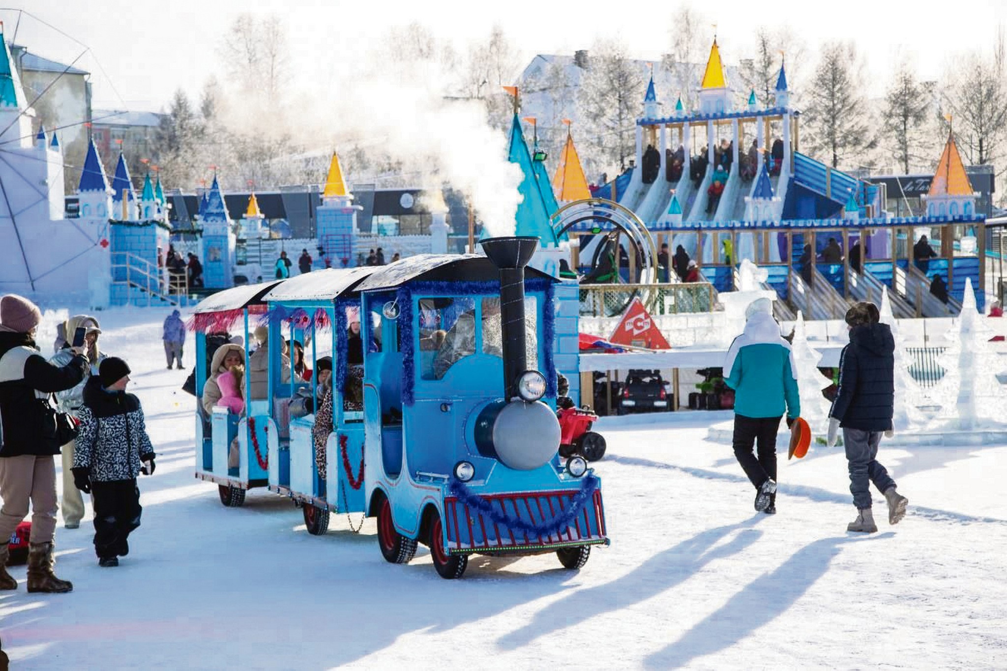 Помимо ледяных аттракционов, в «Хрустальной сказке» есть еще много разных развлечений, например, можно прокатиться на паровозике