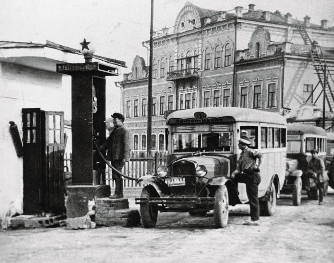 В Иркутске в конце 1920-х и в 1930-х годах пассажиров по городу возили несколько заводских автобусов на базе советского серийного грузового автомобиля АМО-Ф‑15. Они поступили в «Автопромторг» одними из самых первых. На фото, датированном 1939 годом, вы видите, как водитель заправляет такую машину. А ее уменьшенная модель сейчас стоит в музее «Иркутскавтотранса»: экспозицию подготовили к юбилею предприятия