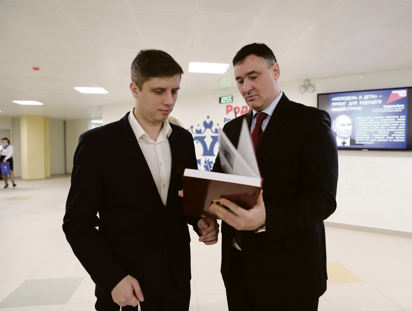 Фасад новой школы, которую город успешно построил за два с небольшим года, оформлен с акцентом на 80-летие Победы. На фото — мэр Иркутска Руслан Болотов и директор учебного заведения Алексей Тугарин в день завершения строительства школы (29 декабря 2025 года). Руслан Николаевич подарил Алексею Александровичу солидное издание книги «Иркутск — город трудовой доблести» и пожелал успехов в дальнейшей работе. Ведь быть руководителем уникальной школы не только почетно, но и ответственно