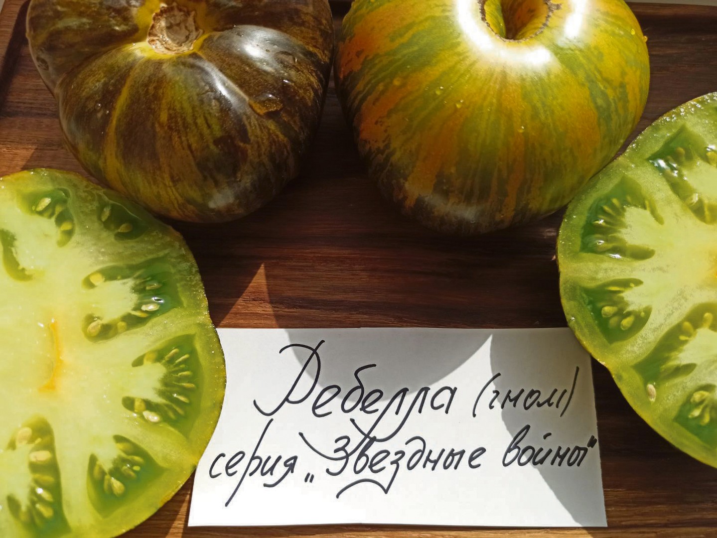 Помидоры сорта «Ребелла» выглядят непривычно — они зеленые с антоциановыми полосками. Садоводы ценят этих «гномов» за устойчивость ко многим заболеваниям и растрескиванию плодов и отмечают, что в открытом грунте они вырастают более сладкими, чем в теплице