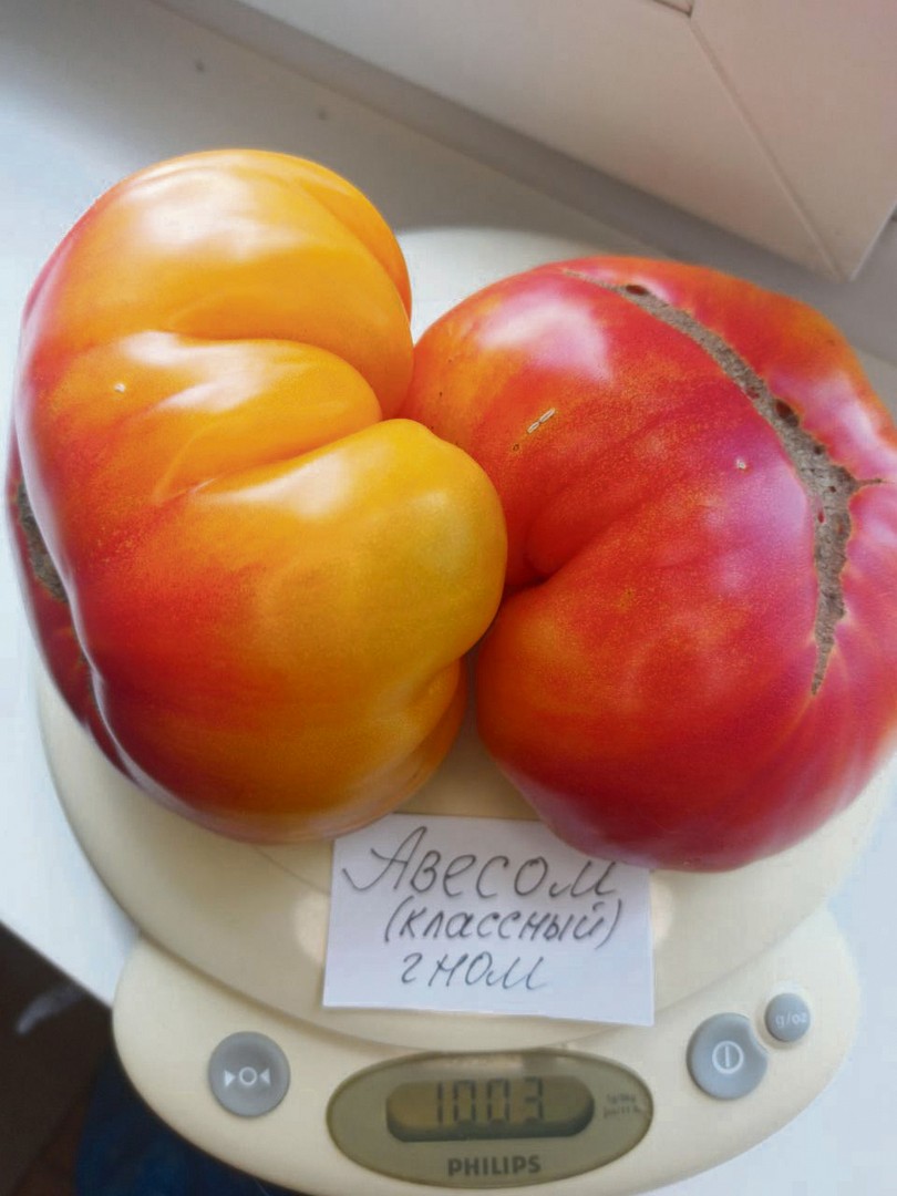 Мал «гном», да удал: всего два помидора весят целый килограмм! Куст сорта «Авесом» вырастает до 1,2 м высотой, зато какие крупные он дает плоды! Они прекрасно подходят не только для еды, но и для заготовок томатного сока и соусов (если не жалко)