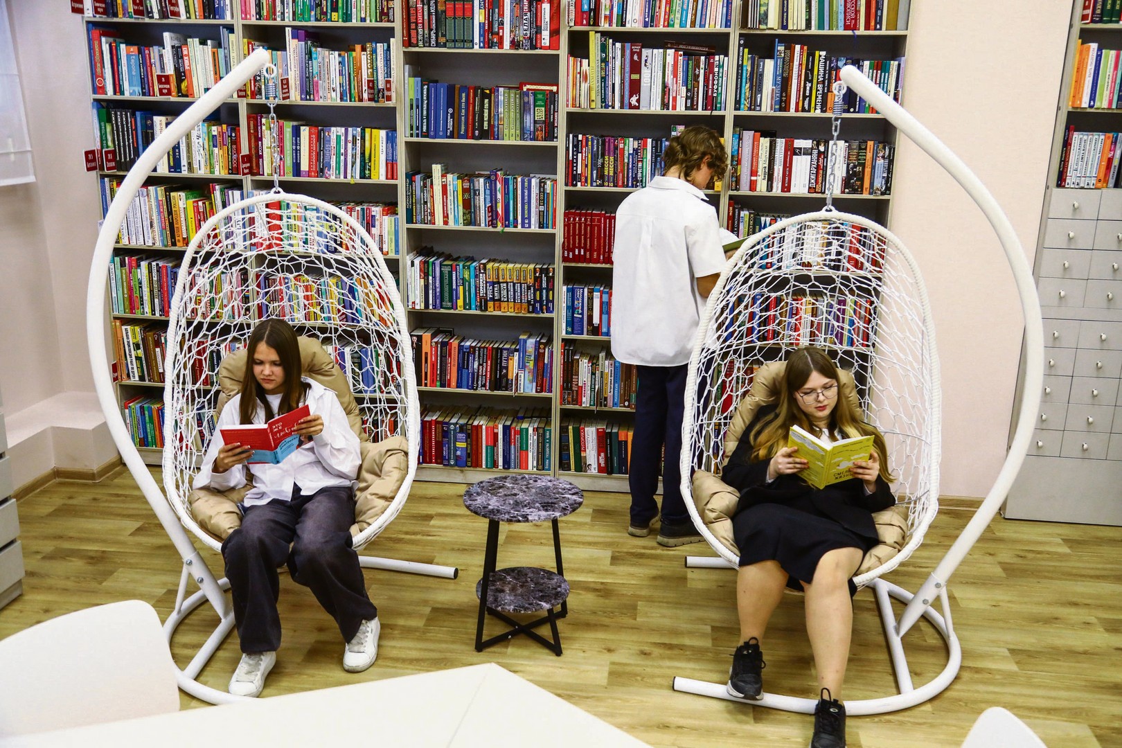— Это «Гостиная» — главное место в библиотеке, оно отведено для мероприятий, — рассказывает и показывает Татьяна Георгиевна.— «Мир детства» — крыло для малышей и школьников, «Читай-зона» — место, где посетитель взаимодействует с книгами и библиотекарем, «Зона отдыха и общения» — в этой части стеллажи с самыми разными книгами, с двумя подвесными креслами и мобильными столами-трансформерами, которые можно превратить в круг или расставить как индивидуальные парты.