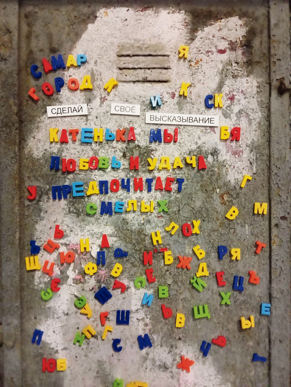 Магнитные буквы на металлической дверце: казалось бы, это просто детская игрушка! Но иркутский фотограф Алексей Головщиков, разместив «липкий алфавит» на трансформаторной будке на улице Карла Маркса, спровоцировал горожан на откровения. Взрослые люди сразу использовали это место как доску объявлений, оставляя на будке признания в любви, пожелания близким и друзьям и даже цитаты. Не зря Алексей назвал свой арт-объект «Сделай свое высказывание»