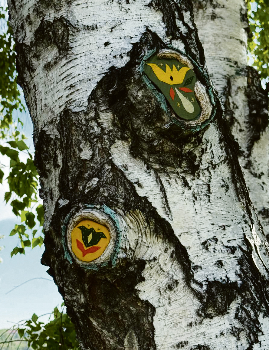 — К нам примкнули не только стрит-артеры, но и архитектор Алена Семиусова, скульптор Павел Михайлов, фотограф Алексей Головщиков, тату-мастер Виктория Хтонь… То есть у нас попутно получилось еще и открыть несколько новых авторов! — рассказывает Лена. — Первый раз мы собрались во дворе за теннисным столом, устроили чаепитие с пирогами, рассказали о своей идее, тут же сделали первую работу — на гаражах возле набережной я наклеила изображение женщины с ребенком. Потом художница Аня Макарова сделала «заплатки» из экологичной ткани, приклеенной к спилам на стволах деревьев.