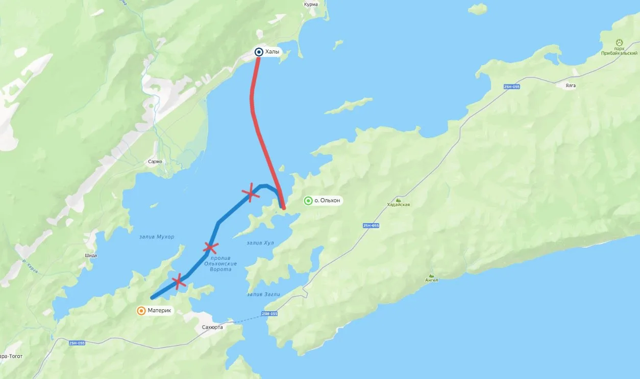 В этом году переправа на Ольхон проходит по новому маршруту - от местности Халы (Хадарта) на материковой части до залива Иркутская Губа на острове. Решение об организации переправы в этом месте приняла специальная комиссия. Специалисты разровняли ледовое поле и сделали две полосы движения, ликвидировали торосы, залили водой небольшие трещины, установили вешки, обозначающие границы дороги, дорожные знаки, ограничивающие грузоподъемность и скорость движения, а также информирующие, где указаны правила пользования ледовой переправой. Традиционно переправу на Ольхон до залива Иркутская Губа делали из Куркутского залива.