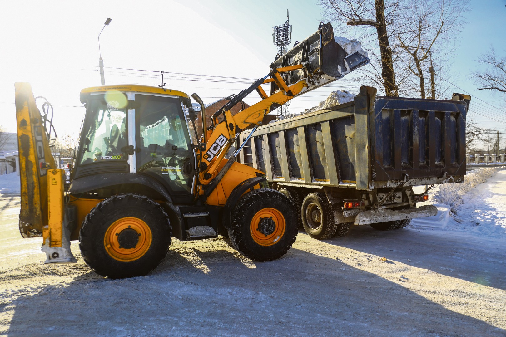 Классический комплекс «Иркутскавтодора» для работы на дороге — погрузчик и самосвал. К нему, разумеется, «прилагаются» два водителя, а еще один-три уборщика территорий с лопатами. В кузов входит около 25 тонн снега! Как только он заполняется, машина отправляется на снегоотвал