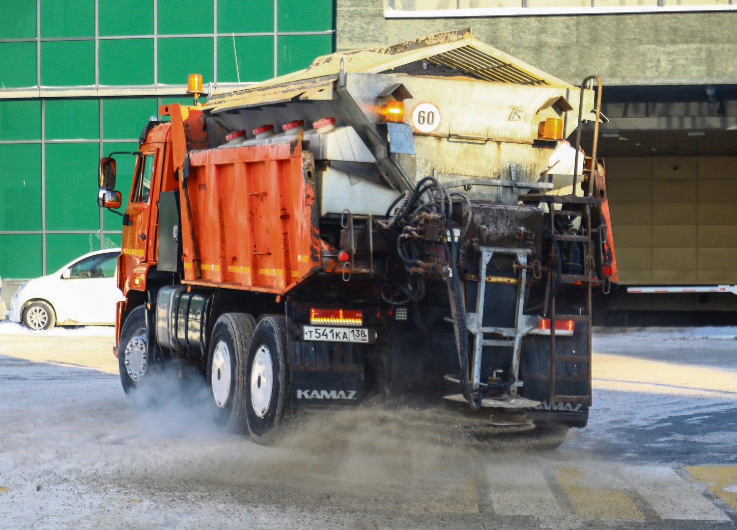 Перед нами — комбинированная дорожная машина на базе КамАЗа и ее установка распределения противогололедной смеси в действии. Специальный отсек техники наполнен отсевом, который установка разбрасывает по проезжей части