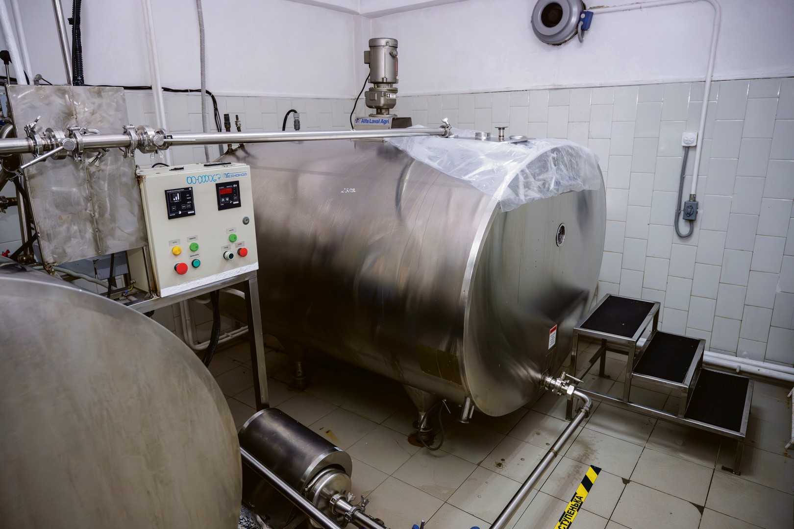 Все цеха расположены рядом, но за отдельными дверями. В каждом из них находится множество емкостей разного объема. На некоторых впечатляющая отметка — 500 литров! Современное автоматическое оборудование позволяет с максимальной точностью отмерить нужное количество молока.