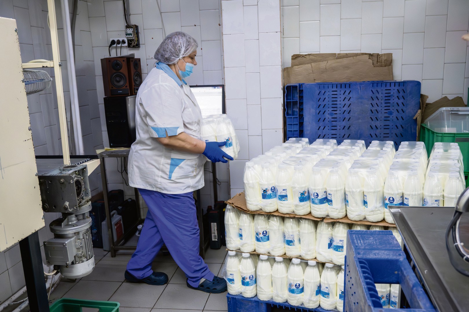 За 10 минут техника наполняет около 100 литровых бутылок молока. На другом конце конвейера их принимает оператор Екатерина Федорова и контролирует наличие даты на крышке и наклейки на бутылке. Если все в порядке, она ставит молоко на ленту вакууматора.