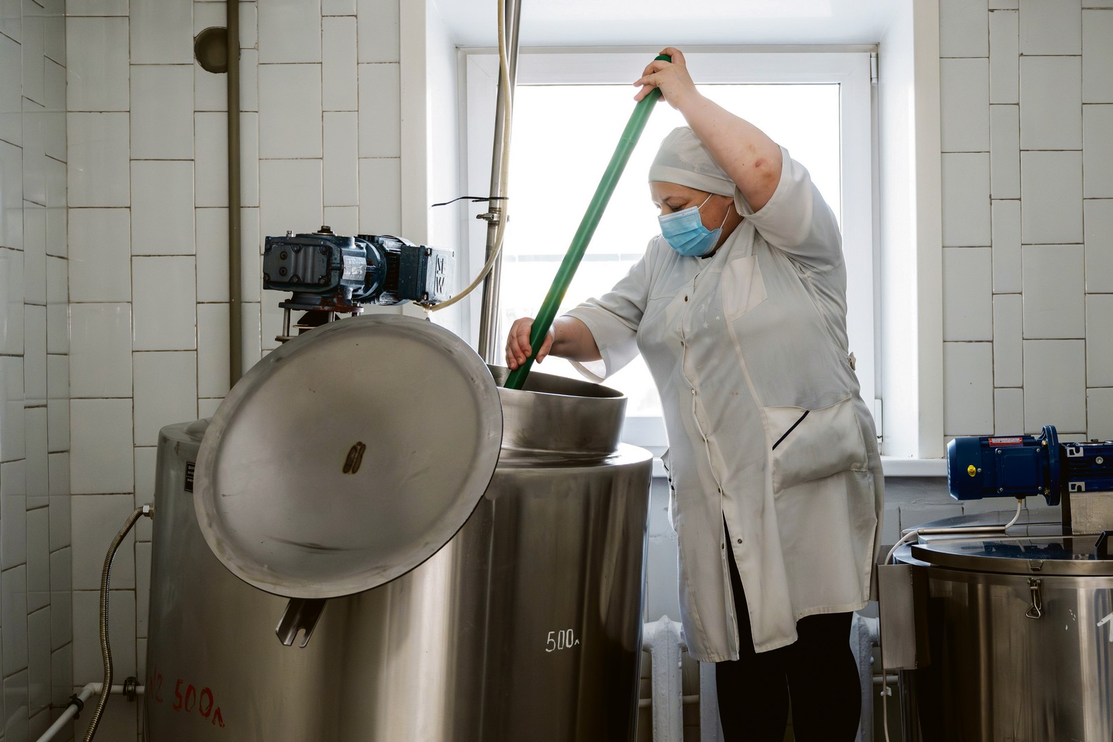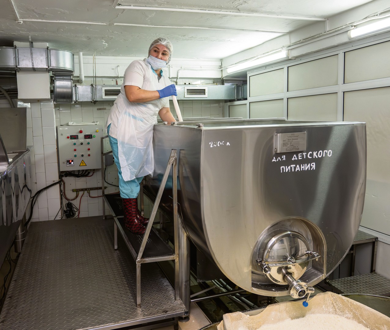 Ирина Поповцева, мастер производства «Детской молочной кухни», готовит йогурт — изредка перемешивает продукт, чтобы убедиться, что фруктовый наполнитель равномерно растворяется в молоке. Под контролем Ирины Сергеевны — все технологические процессы: от приемки молока в цехе до отправки готовой продукции в холодильник