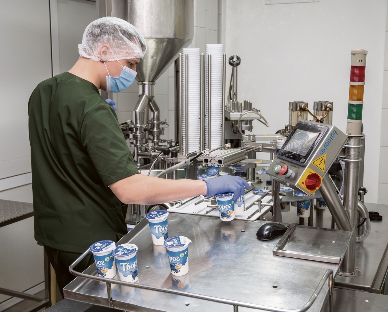 Фасовочным автоматом для упаковки творога управляет Максим Попов, инженер «Детской молочной кухни». Он наполняет емкость готовым продуктом, загружает стаканы, настраивает «датер» и следит за наличием в нем чернил. Все остальные действия выполняются автоматически и очень быстро, буквально за секунды