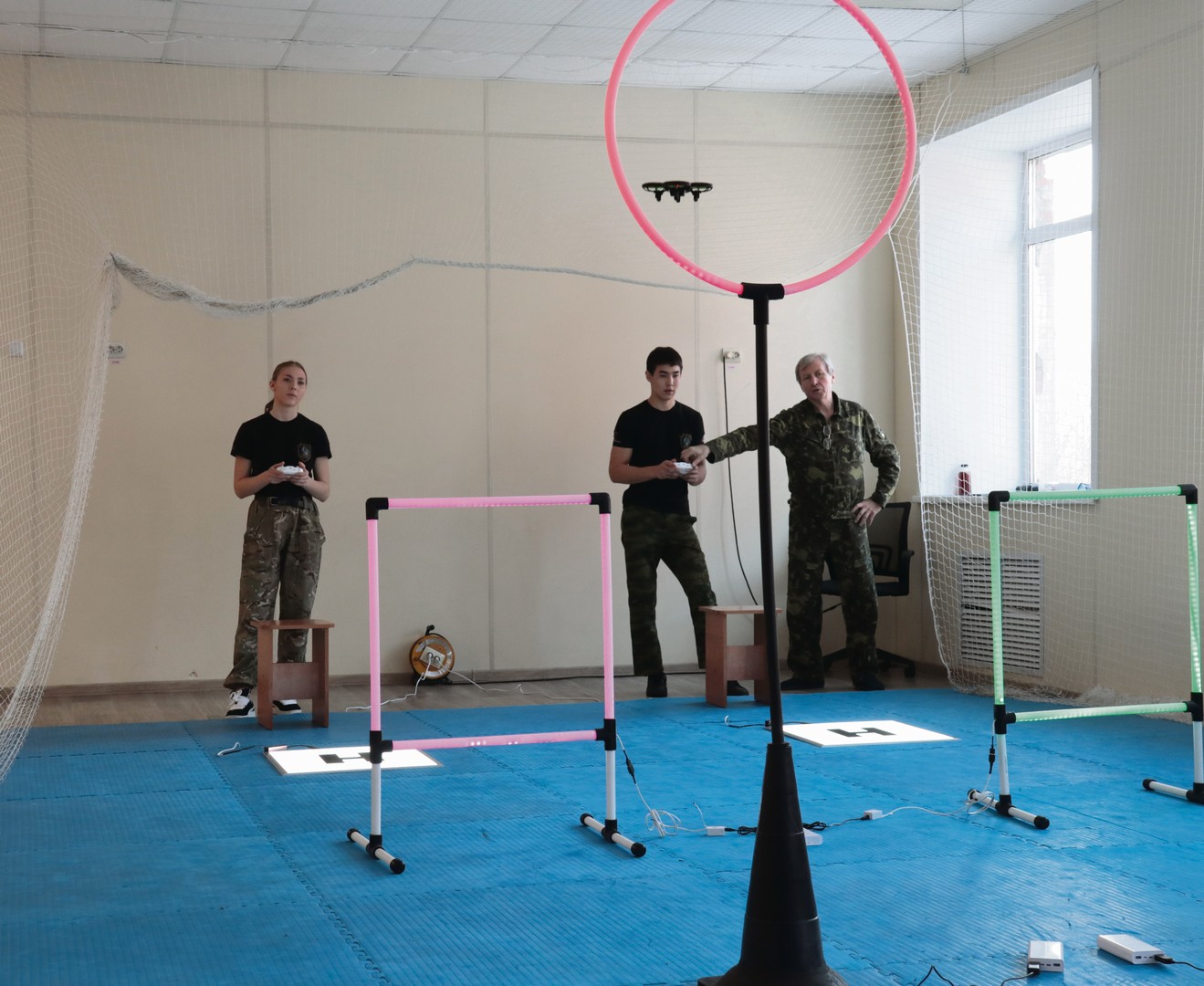 Задача у операторов дронов — поднять аппарат с площадки, пролететь сквозь квадратную рамку, затем сквозь круглую — уже на другой высоте, вернуться по прямой и посадить на базу. На все манипуляции дается 30 секунд.