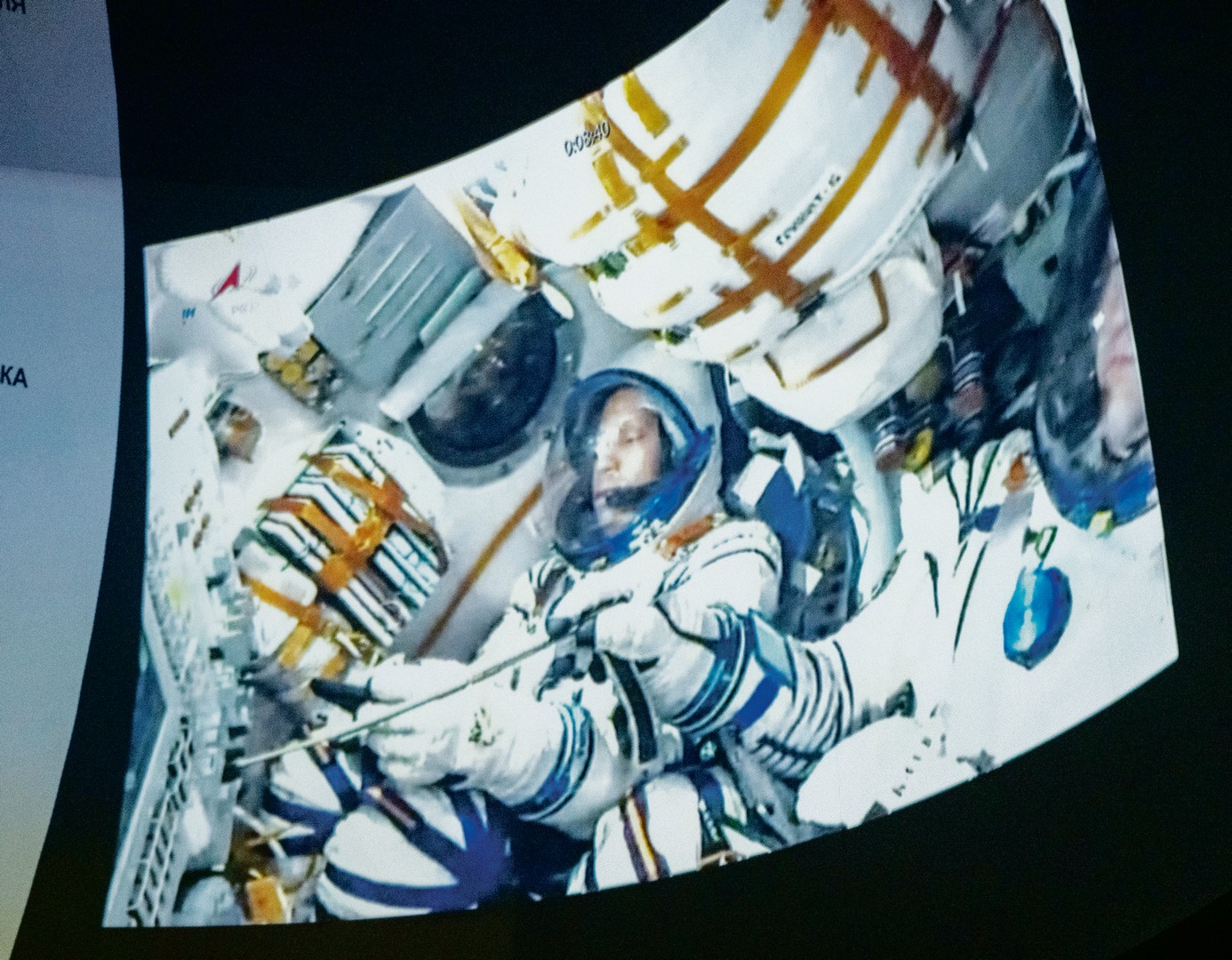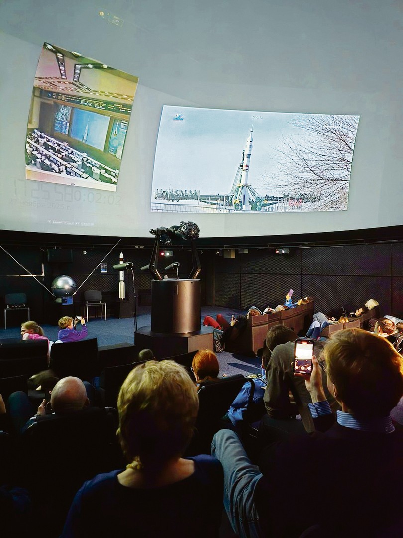 Стоп-кадр с полнокупольного экрана планетария школы № 19 во время прямой трансляции запуска «Союза МС‑28» вечером 27 ноября. Космонавты испытывают различные перегрузки, выходя на орбиту: эти ощущения могут быть физическими и эмоциональными. Но экипаж был предельно спокоен — ни один мускул не дрогнул на их лицах, они улыбались и были сосредоточены на технических характеристиках полета