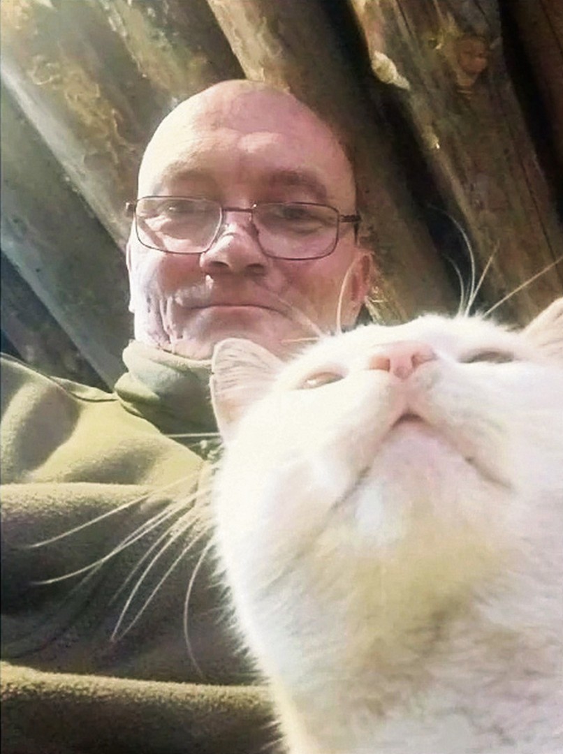 Павел Безденежных в блиндаже с котом по кличке Леня. Кот сам пришел к бойцам, видимо, из ближайшей деревни. Сначала очень боялся людей. Но прижился, пригрелся, стал есть с рук и спать в ногах. Кров и еду «отрабатывает» своими котячьими способностями: в блиндажах постоянное нашествие самых разнообразных грызунов. «Без кота считай, что у тебя нет ни продуктов, ни одежды — все будет сгрызено», — объяснил Павел Викторович