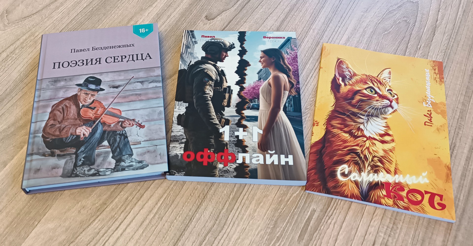Есть у Павла Безденежных хобби — писать стихи, пьесы, баллады. Выпустил уже несколько книг — бумажных и электронных. Его произведения — об отношениях между людьми, о чувствах, переживаниях, любви и радости. Но книга «1 + 1 оффлайн» (на фото) — про войну. Павел Викторович написал ее в соавторстве со своей ученицей Вероникой Зуевой: два взгляда на происходящее — из окопа на СВО и из мирной жизни