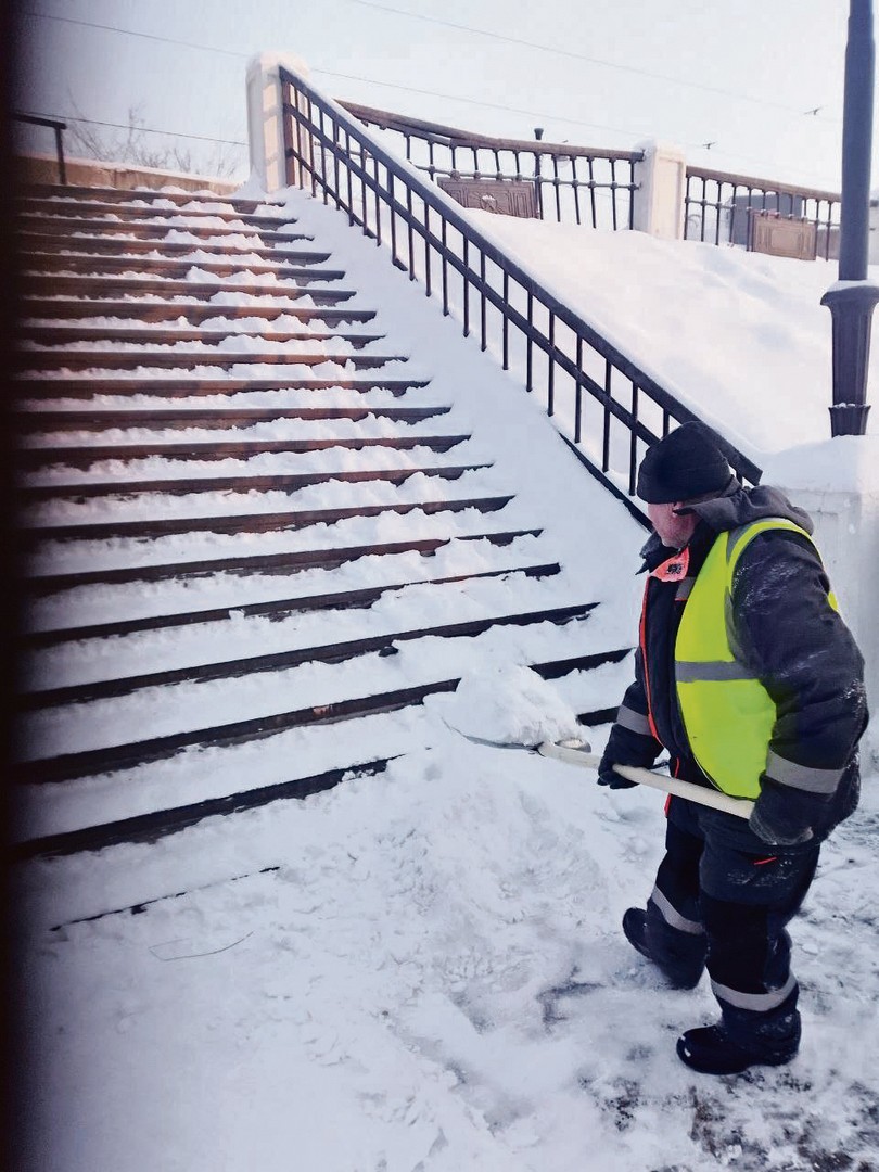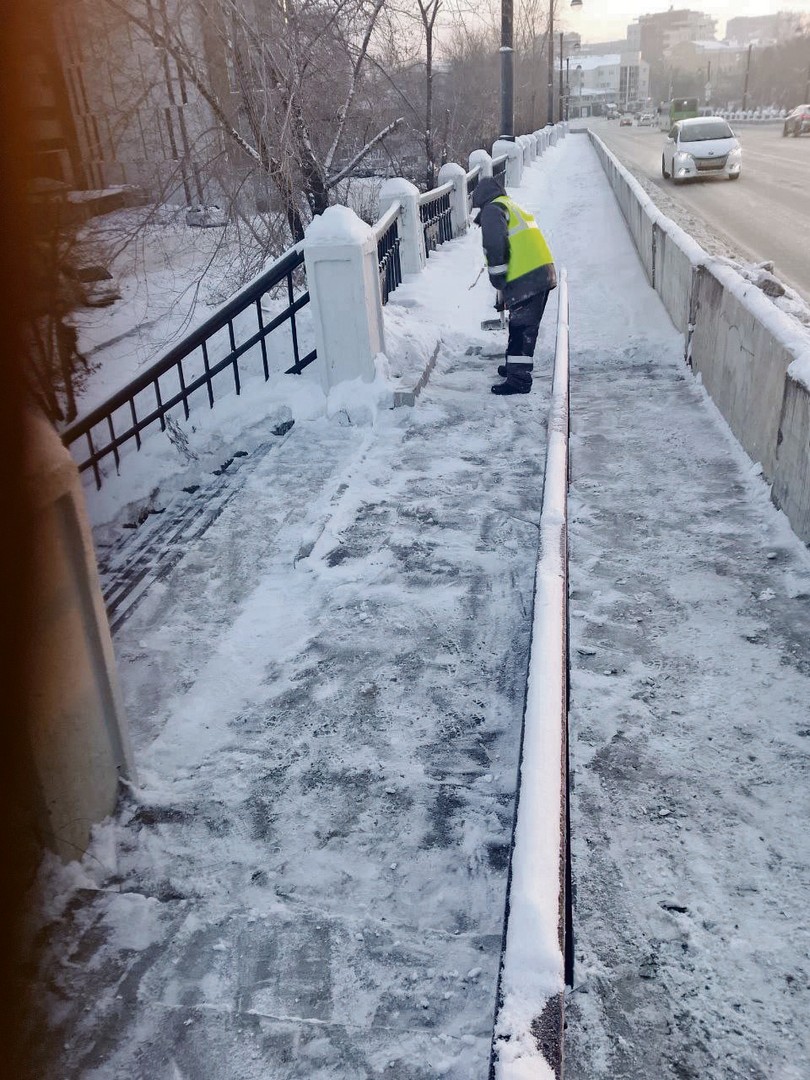 Утро четверга, 15 января. На улице — 26 градусов мороза. Сотрудники муниципального предприятия «Служба эксплуатации мостов» очищают лестницы и тротуары Глазковского моста. Эту работу можно сделать только вручную, а длина моста — 1245 метров, и тротуары у него с двух сторон. То есть люди с лопатами должны пройти около двух с половиной километров, очищая снег!