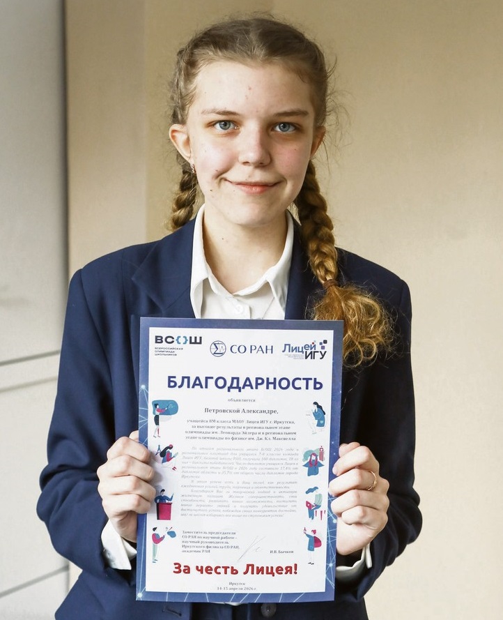 Ученица восьмого математического класса Лицея ИГУ Александра Петровская стала победителем олимпиады Максвелла (по физике) и призером второй степени олимпиады Эйлера (по математике). Девушка — круглая отличница, любит физику и терпит математику: вне уроков занимается на дополнительных групповых занятиях с педагогом вуза, а также заряжается мотивацией от родителей