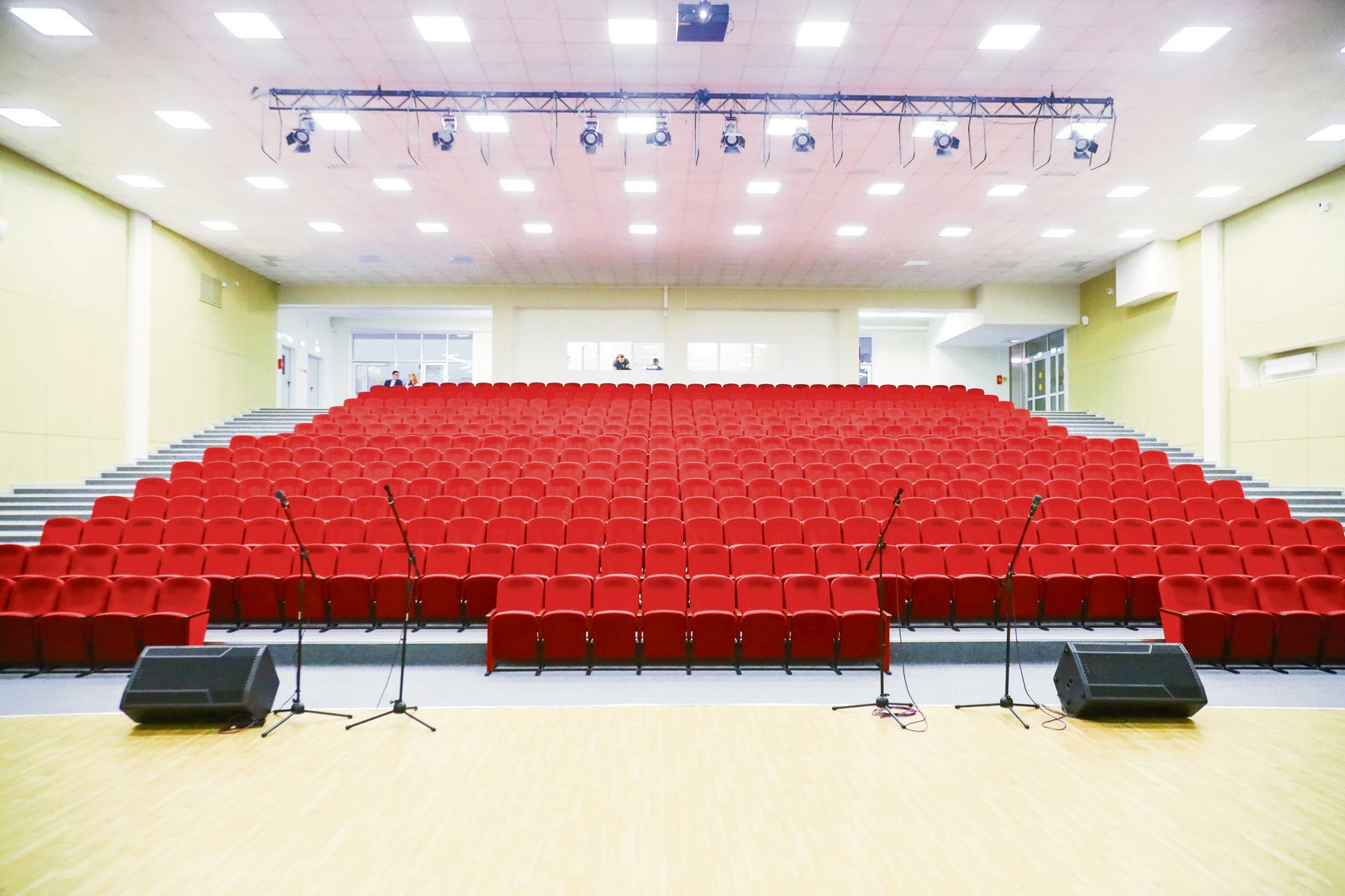 Особая гордость школы — актовый зал на 550 мест. Его вместимость может составить конкуренцию главным театрам областного центра. Для сравнения: в Иркутском ТЮЗе имени Вампилова — 385 мест. И акустика здесь великолепная, это смогли оценить все присутствовавшие, когда хор Иркутского регионального колледжа педагогического образования исполнил песню про наш любимый город. Гости решили и сами выйти на сцену — для общего фото на память