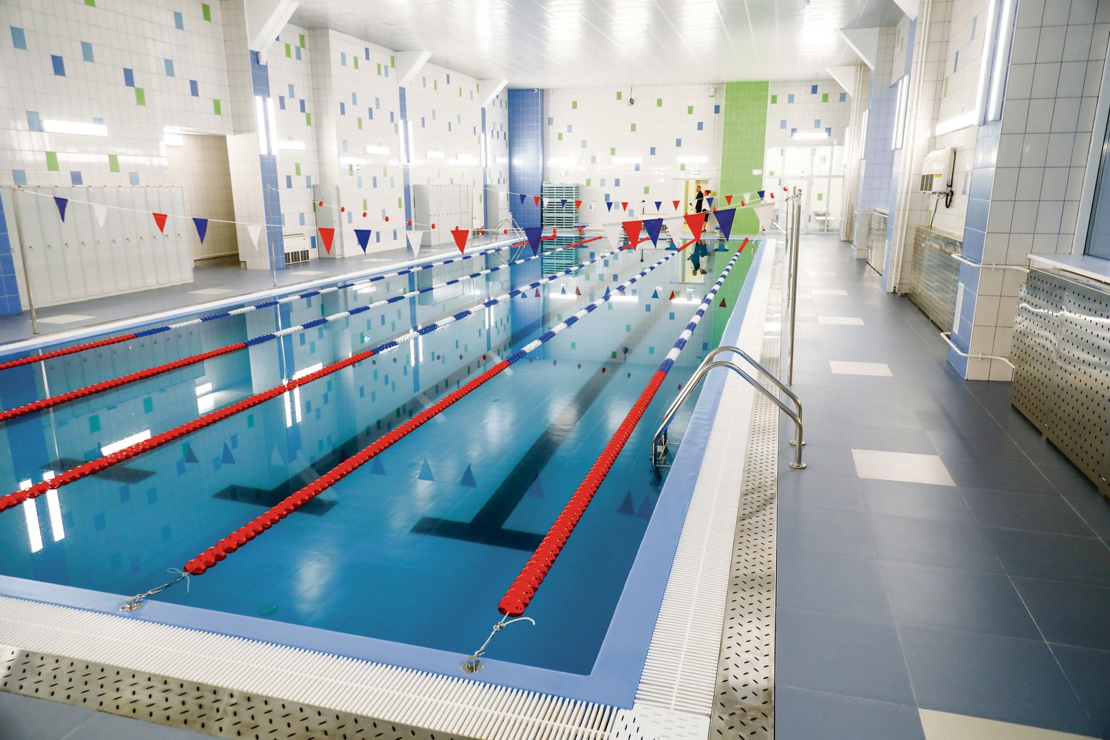 Это единственный 25-метровый бассейн в микрорайоне Ново-Ленино. И он, как нетрудно догадаться, находится в новой школе на Ярославского. Кроль, брасс, баттерфляй, плавание на спине — всему научатся ученики, которым повезет здесь заниматься