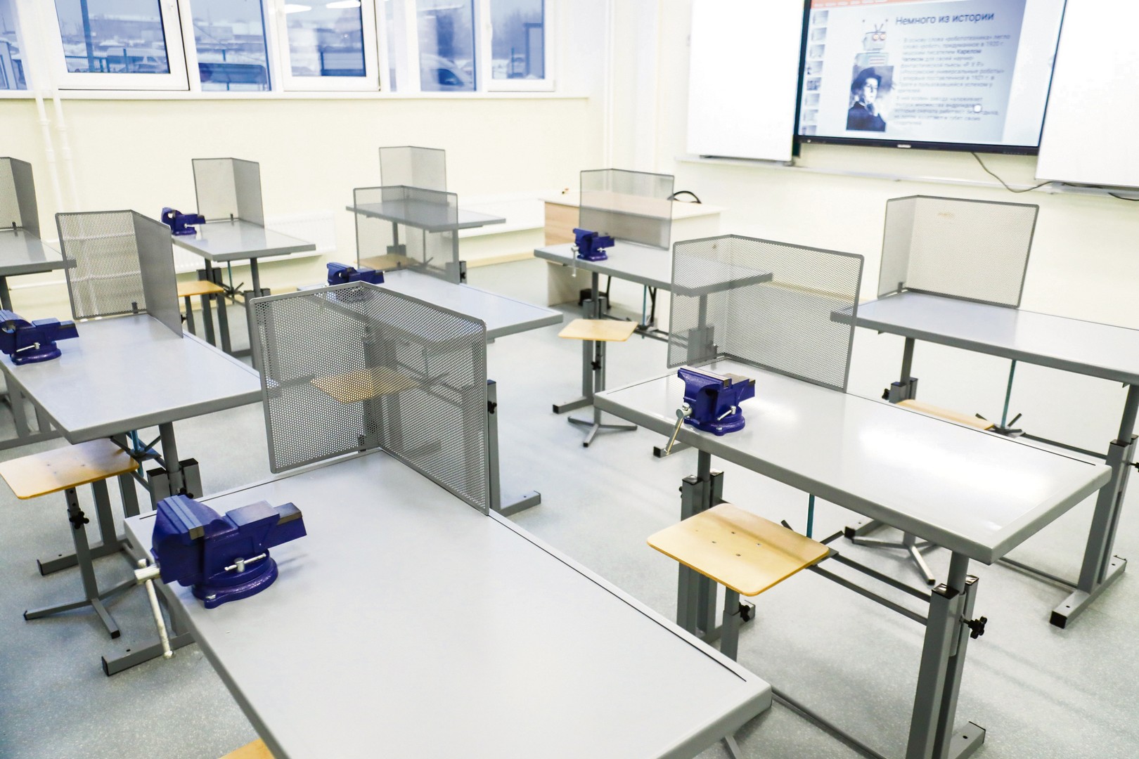 Класс преподавания технологии для мальчиков, помимо станков, оснащен специализированной мебелью. Здесь установлены универсальные верстаки (столярные и слесарные) с тисками, а сетка защищает учеников в процессе работы. Интерактивная доска поможет преподавателю донести материал максимально наглядно