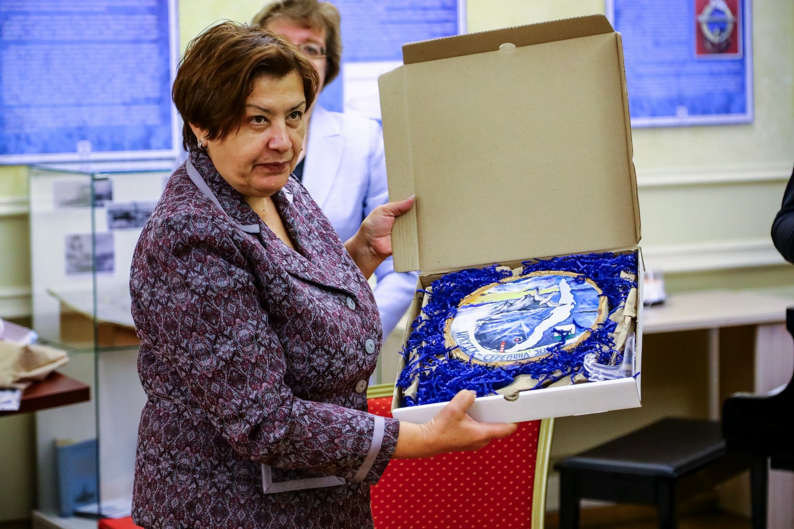 Самого красивого музыкального руководителя детского сада Иркутска — 2025 Ольгу Анатольевну Решетникову награждает директор главной кузницы иркутских педагогов — педагогического колледжа Ирина Александровна Синцова. В подарок победительница получила сувенир «Иркутск — середина земли». Это спил дерева с изображением Байкала, изготовленный студентами отделения художественного образования педколледжа