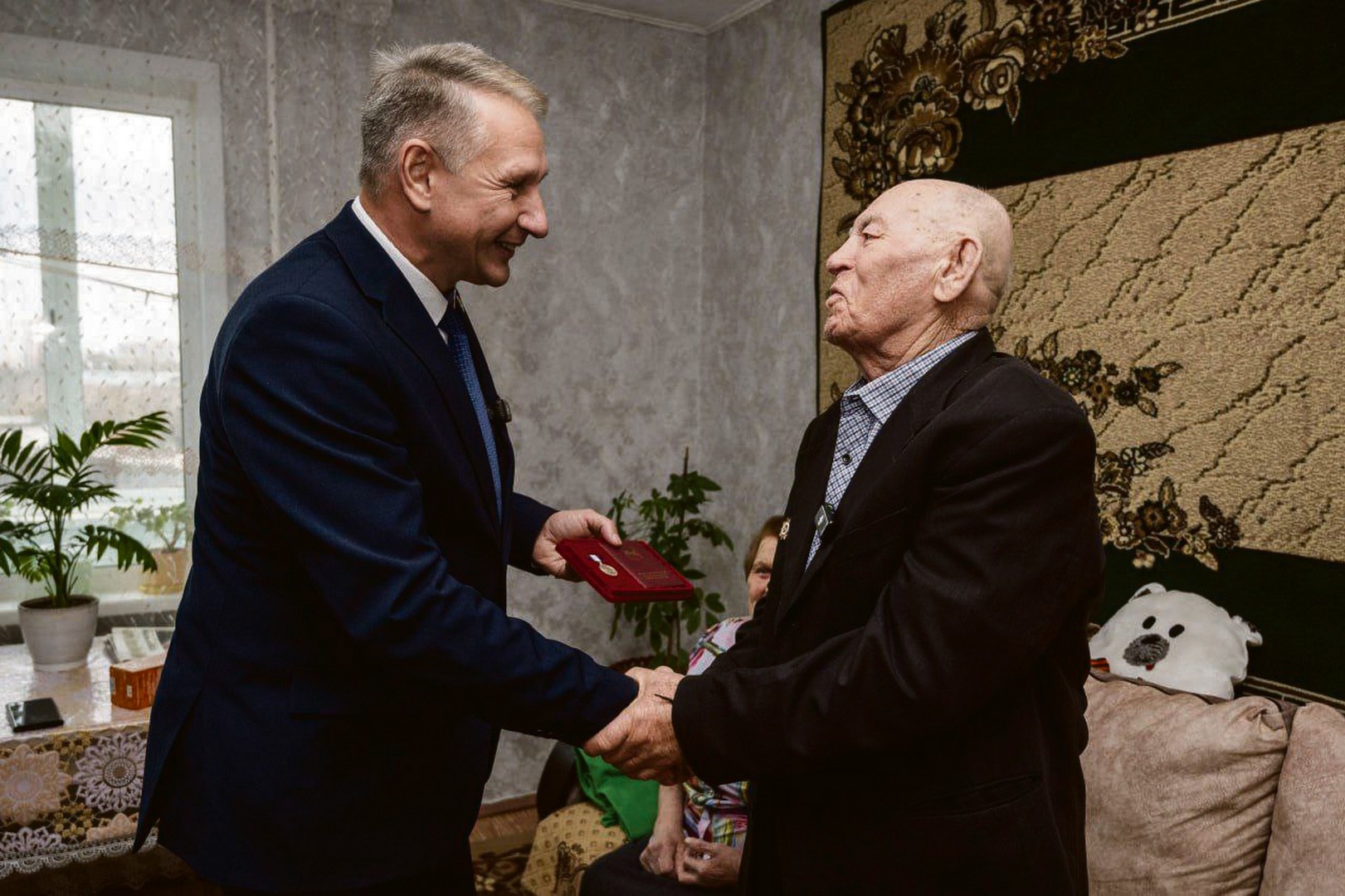 Глава Свердловского округа Иркутска Антон Медко вручает удостоверение и знак «Почетный гражданин Иркутской области» Михаилу Ефимовичу Мельникову. С 1943-го он воевал на Белорусском фронте, был радистом, дошел до Кенигсберга, где встретил Победу. Имеет много фронтовых наград: орден Отечественной войны I степени, медаль Жукова, а также «За боевые заслуги», «За победу над Германией» и другие. В ноябре ветеран отметит столетний юбилей!