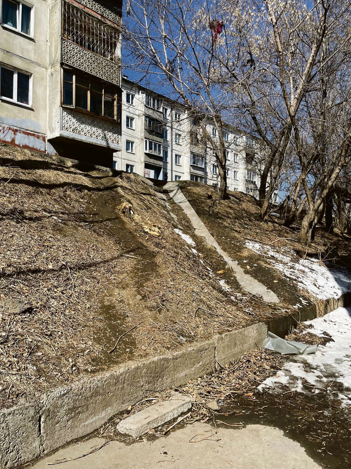 Более чем наглядно: на фото слева — то, как выглядел склон, по которому спускались к тротуару жители дома № 31 на бульваре Рябикова. На фото справа — новая бетонная лестница на этом участке. А скоро появятся и поручни