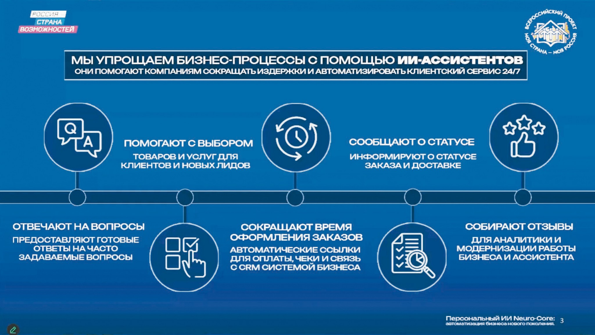 Он сразу взялся за дело. Его идея заключалась в том, чтобы создать для предпринимателей умных ассистентов — ботов, основанных на базе искусственного интеллекта, способных отвечать онлайн на различные вопросы клиентов и продвигать бизнес. Здесь юноше помогли курсы по программированию, которые он посещал в течение трех лет. Проект получил название Neuro-Core, уже в январе его опробовали на практике.