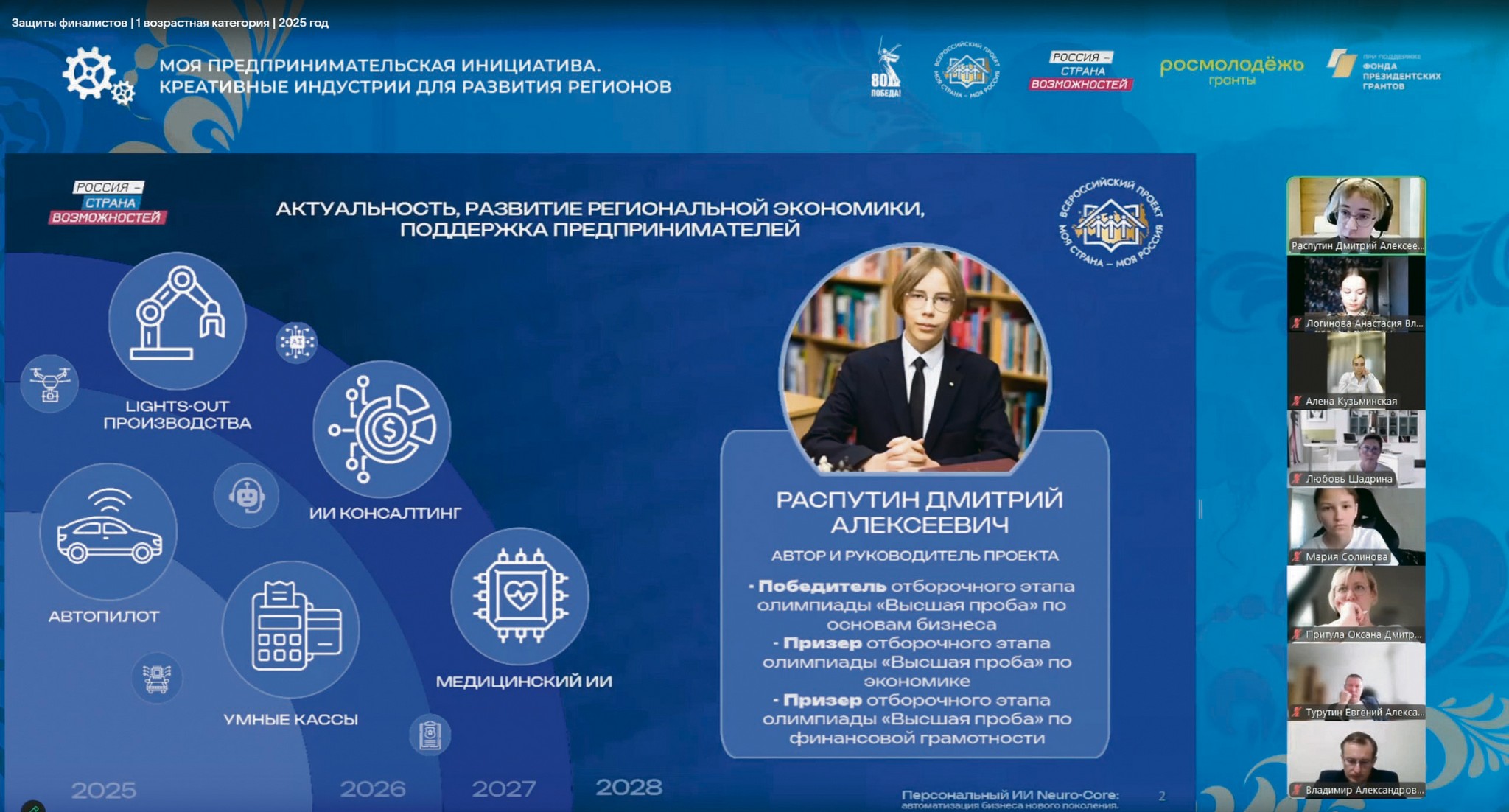 Кадры с онлайн-защиты проекта Дмитрия Распутина Neuro-Core в номинации «Моя предпринимательская инициатива. Креативные индустрии для развития регионов». На выступление с презентацией каждому участнику давали пять минут, после — вопросы от жюри. Работа Дмитрия привлекла внимание судей своей практической составляющей: в отличие от большинства школьных проектов, Neuro-Core уже был запущен — первого клиента юноша нашел самостоятельно и имел не только долгосрочные планы, но и конкретные результаты