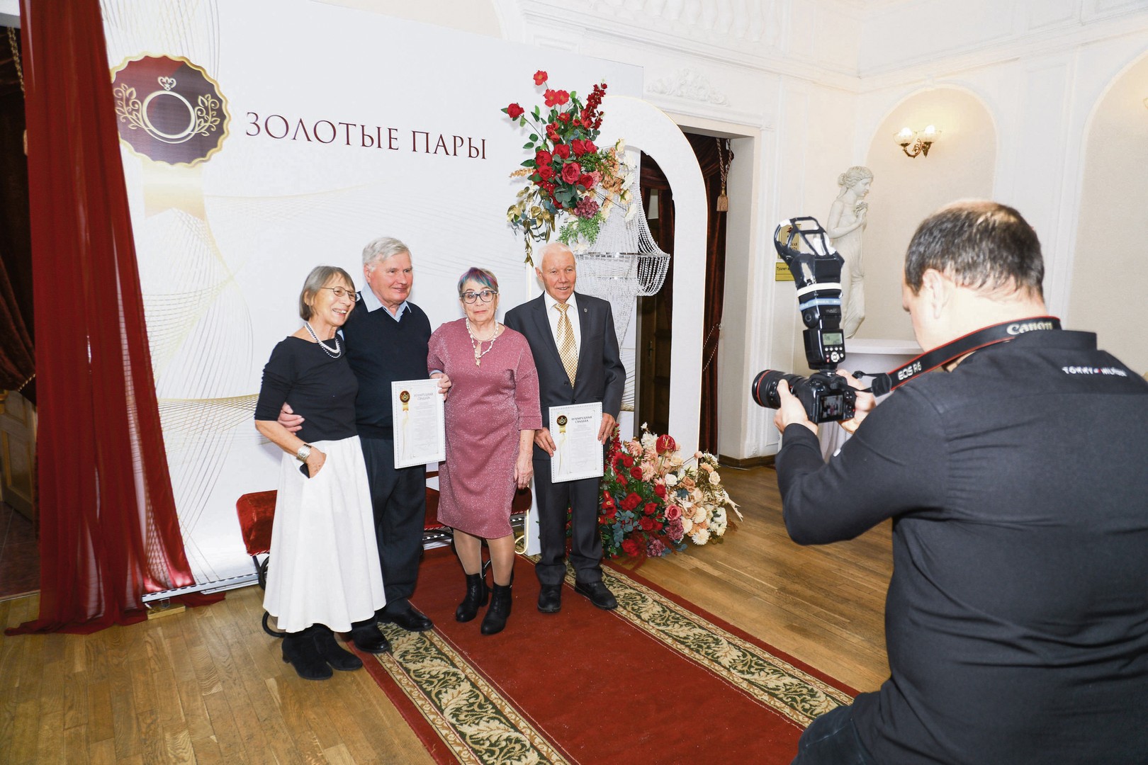 Пары, прошедшие десятилетия рука об руку, 8 декабря встречали в фойе театра и провожали на почетные места в партере. Торжественная обстановка, букеты, несколько фотозон, душевная музыка — такое событие немного смущенные юбиляры запомнят надолго.